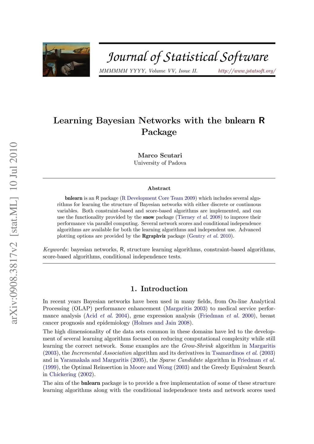 bnlearn is an R package which includes several algorithms for learning the structure of Bayesian networks with either discrete or continuous variables. Both constraint-based and score-based algorithms are implemented, and can use the functionality provided by the snow package to improve their performance via parallel computing. Several network scores and conditional independence algorithms are available for both the learning algorithms and independent use. Advanced plotting options are provided by the Rgraphviz package.
