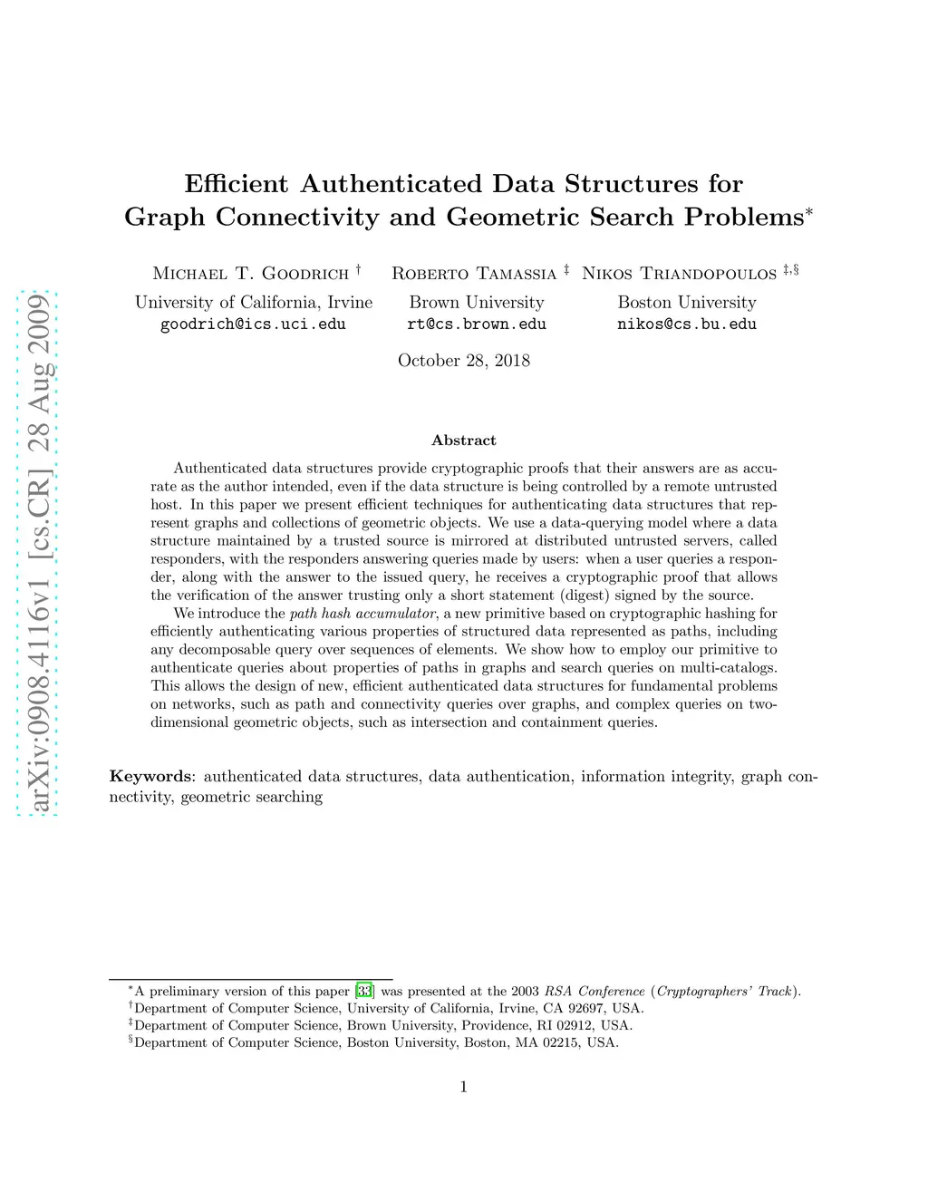 Authenticated data structures provide cryptographic proofs that their answers are as accurate as the author intended, even if the data structure is being controlled by a remote untrusted host. We present efficient techniques for authenticating data structures that represent graphs and collections of geometric objects. We introduce the path hash accumulator, a new primitive based on cryptographic hashing for efficiently authenticating various properties of structured data represented as paths, including any decomposable query over sequences of elements. We show how to employ our primitive to authenticate queries about properties of paths in graphs and search queries on multi-catalogs. This allows the design of new, efficient authenticated data structures for fundamental problems on networks, such as path and connectivity queries over graphs, and complex queries on two-dimensional geometric objects, such as intersection and containment queries.