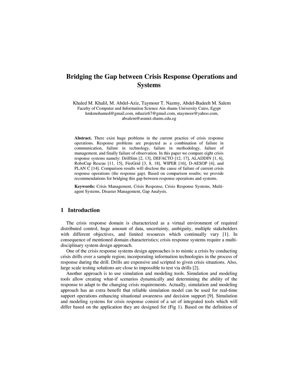 There exist huge problems in the current practice of crisis response operations. Response problems are projected as a combination of failure in communication, failure in technology, failure in methodology, failure of management, and finally failure of observation. In this paper we compare eight crisis response systems namely: DrillSim [2, 13], DEFACTO [12, 17], ALADDIN [1, 6], RoboCup Rescue [11, 15], FireGrid [3, 8, 18], WIPER [16], D-AESOP [4], and PLAN C [14]. Comparison results will disclose the cause of failure of current crisis response operations (the response gap). Based on comparison results; we provide recommendations for bridging this gap between response operations and systems.