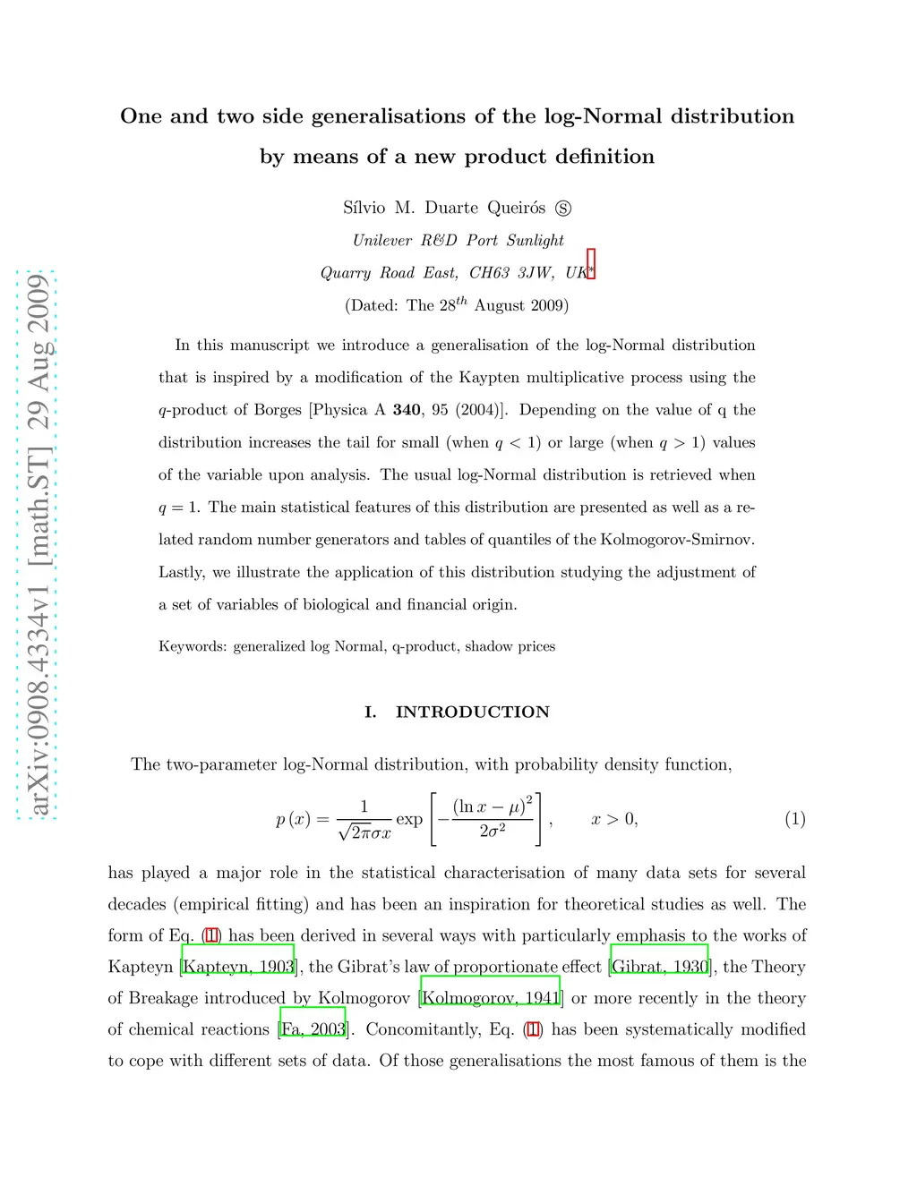 In this manuscript we introduce a generalisation of the log-Normal distribution that is inspired by a modification of the Kaypten multiplicative process using the -product of Borges [Physica A \textbf{340}, 95 (2004)]. Depending on the value of q the distribution increases the tail for small (when ) or large (when ) values of the variable upon analysis. The usual log-Normal distribution is retrieved when . The main statistical features of this distribution are presented as well as a related random number generators and tables of quantiles of the Kolmogorov-Smirnov. Lastly, we illustrate the application of this distribution studying the adjustment of a set of variables of biological and financial origin.