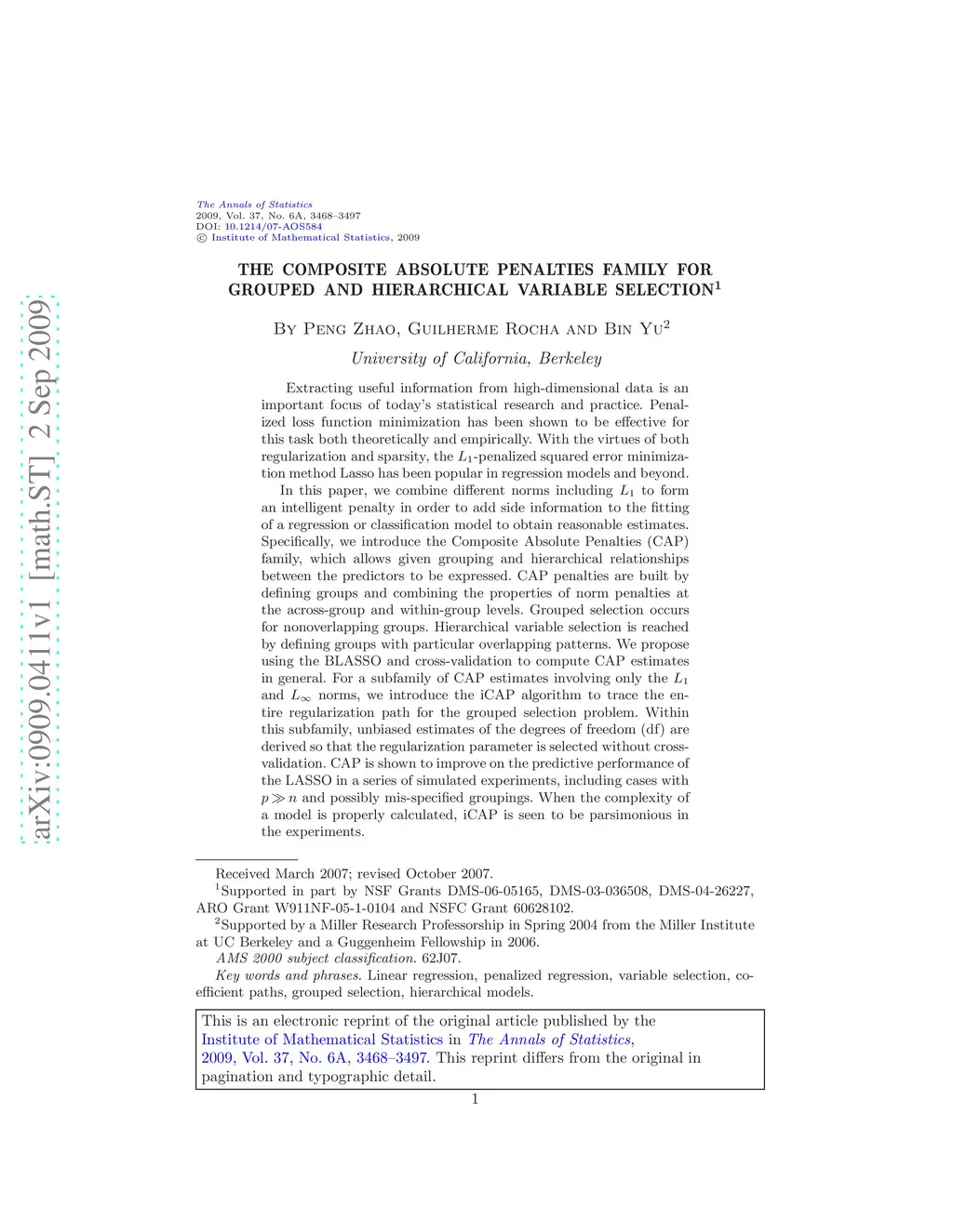 Extracting useful information from high-dimensional data is an important focus of today's statistical research and practice. Penalized loss function minimization has been shown to be effective for this task both theoretically and empirically. With the virtues of both regularization and sparsity, the -penalized squared error minimization method Lasso has been popular in regression models and beyond. In this paper, we combine different norms including to form an intelligent penalty in order to add side information to the fitting of a regression or classification model to obtain reasonable estimates. Specifically, we introduce the Composite Absolute Penalties (CAP) family, which allows given grouping and hierarchical relationships between the predictors to be expressed. CAP penalties are built by defining groups and combining the properties of norm penalties at the across-group and within-group levels. Grouped selection occurs for nonoverlapping groups. Hierarchical variable selection is reached by defining groups with particular overlapping patterns. We propose using the BLASSO and cross-validation to compute CAP estimates in general. For a subfamily of CAP estimates involving only the and norms, we introduce the iCAP algorithm to trace the entire regularization path for the grouped selection problem. Within this subfamily, unbiased estimates of the degrees of freedom (df) are derived so that the regularization parameter is selected without cross-validation. CAP is shown to improve on the predictive performance of the LASSO in a series of simulated experiments, including cases with and possibly mis-specified groupings. When the complexity of a model is properly calculated, iCAP is seen to be parsimonious in the experiments.