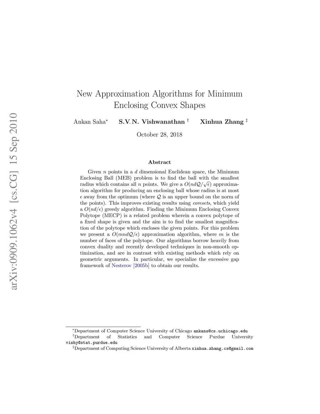 Given points in a dimensional Euclidean space, the Minimum Enclosing Ball (MEB) problem is to find the ball with the smallest radius which contains all points. We give a approximation algorithm for producing an enclosing ball whose radius is at most away from the optimum (where is an upper bound on the norm of the points). This improves existing results using \emph{coresets}, which yield a greedy algorithm. Finding the Minimum Enclosing Convex Polytope (MECP) is a related problem wherein a convex polytope of a fixed shape is given and the aim is to find the smallest magnification of the polytope which encloses the given points. For this problem we present a approximation algorithm, where is the number of faces of the polytope. Our algorithms borrow heavily from convex duality and recently developed techniques in non-smooth optimization, and are in contrast with existing methods which rely on geometric arguments. In particular, we specialize the excessive gap framework of \citet{Nesterov05a} to obtain our results.