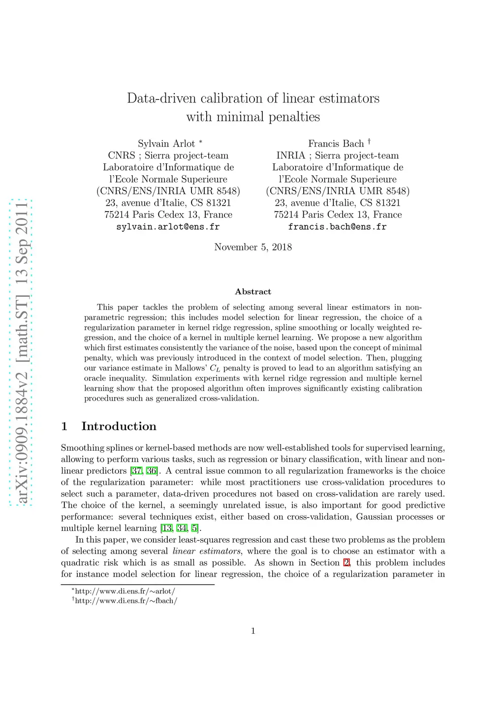 This paper tackles the problem of selecting among several linear estimators in non-parametric regression; this includes model selection for linear regression, the choice of a regularization parameter in kernel ridge regression, spline smoothing or locally weighted regression, and the choice of a kernel in multiple kernel learning. We propose a new algorithm which first estimates consistently the variance of the noise, based upon the concept of minimal penalty, which was previously introduced in the context of model selection. Then, plugging our variance estimate in Mallows' penalty is proved to lead to an algorithm satisfying an oracle inequality. Simulation experiments with kernel ridge regression and multiple kernel learning show that the proposed algorithm often improves significantly existing calibration procedures such as generalized cross-validation.