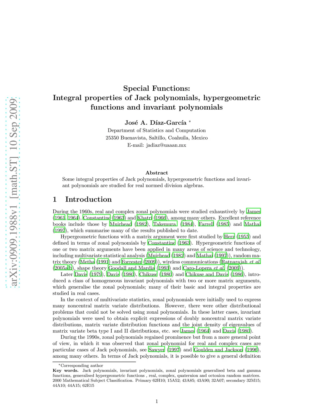 Special Functions: Integral properties of Jack polynomials,