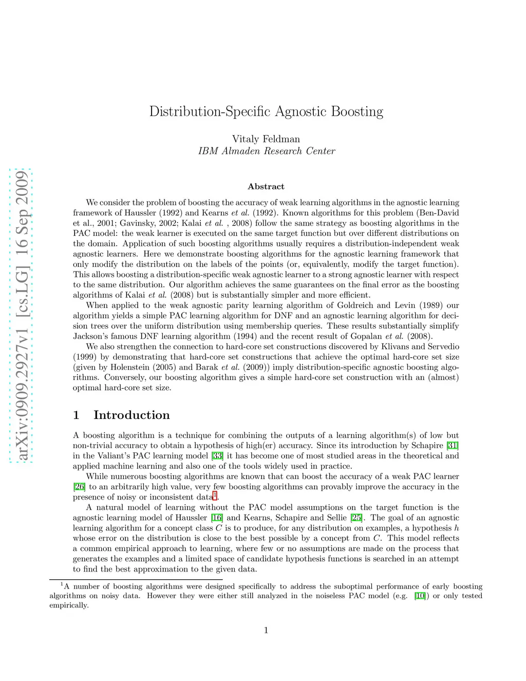 We consider the problem of boosting the accuracy of weak learning algorithms in the agnostic learning framework of Haussler (1992) and Kearns et al. (1992). Known algorithms for this problem (Ben-David et al., 2001; Gavinsky, 2002; Kalai et al., 2008) follow the same strategy as boosting algorithms in the PAC model: the weak learner is executed on the same target function but over different distributions on the domain. We demonstrate boosting algorithms for the agnostic learning framework that only modify the distribution on the labels of the points (or, equivalently, modify the target function). This allows boosting a distribution-specific weak agnostic learner to a strong agnostic learner with respect to the same distribution. When applied to the weak agnostic parity learning algorithm of Goldreich and Levin (1989) our algorithm yields a simple PAC learning algorithm for DNF and an agnostic learning algorithm for decision trees over the uniform distribution using membership queries. These results substantially simplify Jackson's famous DNF learning algorithm (1994) and the recent result of Gopalan et al. (2008). We also strengthen the connection to hard-core set constructions discovered by Klivans and Servedio (1999) by demonstrating that hard-core set constructions that achieve the optimal hard-core set size (given by Holenstein (2005) and Barak et al. (2009)) imply distribution-specific agnostic boosting algorithms. Conversely, our boosting algorithm gives a simple hard-core set construction with an (almost) optimal hard-core set size.