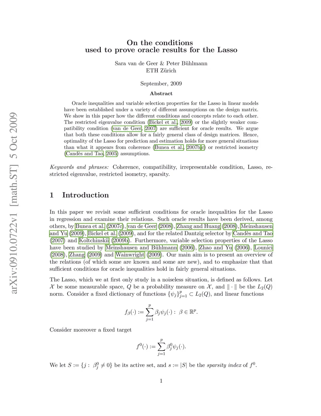 Oracle inequalities and variable selection properties for the Lasso in linear models have been established under a variety of different assumptions on the design matrix. We show in this paper how the different conditions and concepts relate to each other. The restricted eigenvalue condition (Bickel et al., 2009) or the slightly weaker compatibility condition (van de Geer, 2007) are sufficient for oracle results. We argue that both these conditions allow for a fairly general class of design matrices. Hence, optimality of the Lasso for prediction and estimation holds for more general situations than what it appears from coherence (Bunea et al, 2007b,c) or restricted isometry (Candes and Tao, 2005) assumptions.