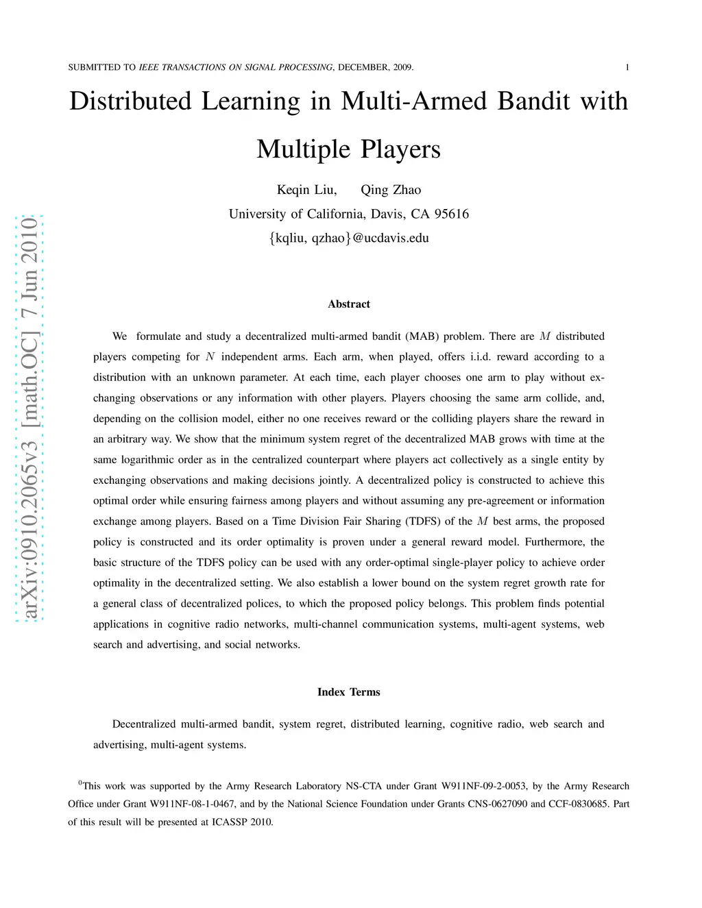 We formulate and study a decentralized multi-armed bandit (MAB) problem. There are M distributed players competing for N independent arms. Each arm, when played, offers i.i.d. reward according to a distribution with an unknown parameter. At each time, each player chooses one arm to play without exchanging observations or any information with other players. Players choosing the same arm collide, and, depending on the collision model, either no one receives reward or the colliding players share the reward in an arbitrary way. We show that the minimum system regret of the decentralized MAB grows with time at the same logarithmic order as in the centralized counterpart where players act collectively as a single entity by exchanging observations and making decisions jointly. A decentralized policy is constructed to achieve this optimal order while ensuring fairness among players and without assuming any pre-agreement or information exchange among players. Based on a Time Division Fair Sharing (TDFS) of the M best arms, the proposed policy is constructed and its order optimality is proven under a general reward model. Furthermore, the basic structure of the TDFS policy can be used with any order-optimal single-player policy to achieve order optimality in the decentralized setting. We also establish a lower bound on the system regret growth rate for a general class of decentralized polices, to which the proposed policy belongs. This problem finds potential applications in cognitive radio networks, multi-channel communication systems, multi-agent systems, web search and advertising, and social networks.