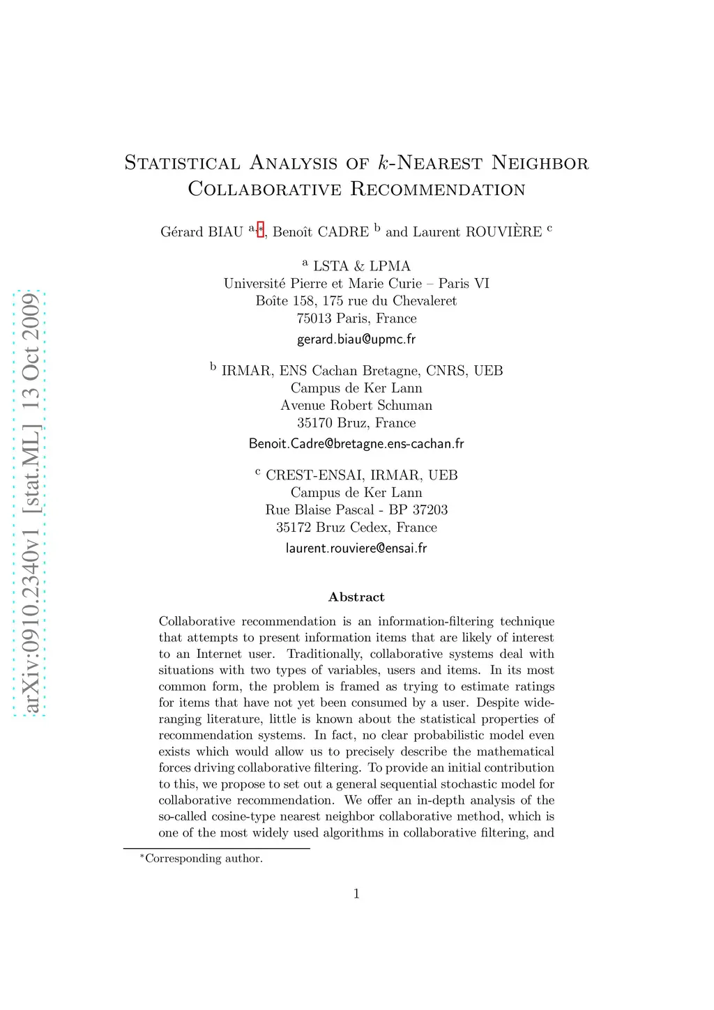 Collaborative recommendation is an information-filtering technique that attempts to present information items (movies, music, books, news, images, Web pages, etc.) that are likely of interest to the Internet user. Traditionally, collaborative systems deal with situations with two types of variables, users and items. In its most common form, the problem is framed as trying to estimate ratings for items that have not yet been consumed by a user. Despite wide-ranging literature, little is known about the statistical properties of recommendation systems. In fact, no clear probabilistic model even exists allowing us to precisely describe the mathematical forces driving collaborative filtering. To provide an initial contribution to this, we propose to set out a general sequential stochastic model for collaborative recommendation and analyze its asymptotic performance as the number of users grows. We offer an in-depth analysis of the so-called cosine-type nearest neighbor collaborative method, which is one of the most widely used algorithms in collaborative filtering. We establish consistency of the procedure under mild assumptions on the model. Rates of convergence and examples are also provided.