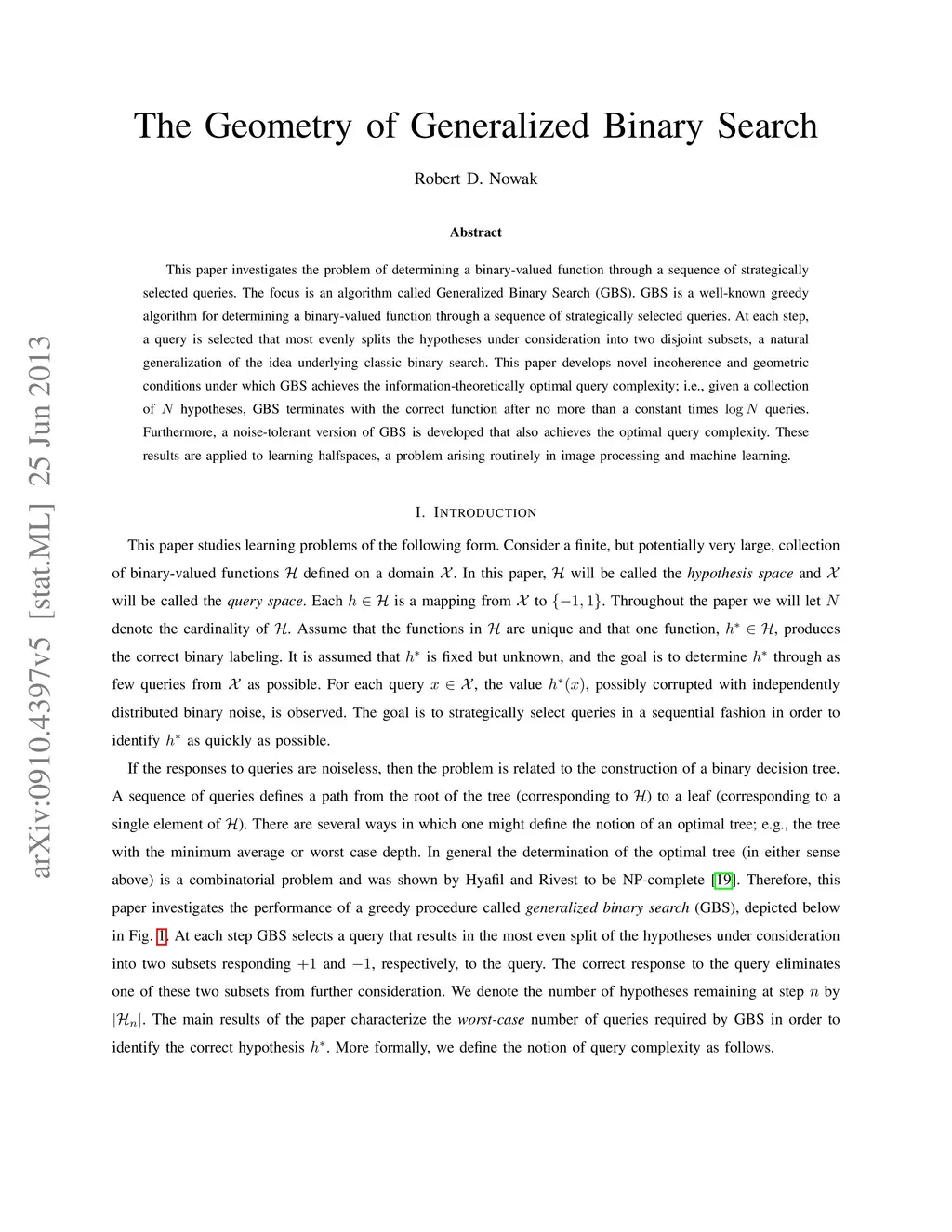 This paper investigates the problem of determining a binary-valued function through a sequence of strategically selected queries. The focus is an algorithm called Generalized Binary Search (GBS). GBS is a well-known greedy algorithm for determining a binary-valued function through a sequence of strategically selected queries. At each step, a query is selected that most evenly splits the hypotheses under consideration into two disjoint subsets, a natural generalization of the idea underlying classic binary search. This paper develops novel incoherence and geometric conditions under which GBS achieves the information-theoretically optimal query complexity; i.e., given a collection of N hypotheses, GBS terminates with the correct function after no more than a constant times log N queries. Furthermore, a noise-tolerant version of GBS is developed that also achieves the optimal query complexity. These results are applied to learning halfspaces, a problem arising routinely in image processing and machine learning.