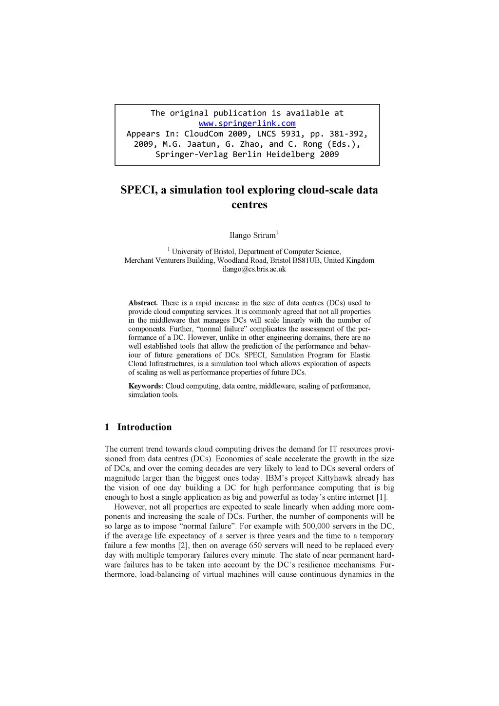 There is a rapid increase in the size of data centres (DCs) used to provide cloud computing services. It is commonly agreed that not all properties in the middleware that manages DCs will scale linearly with the number of components. Further, "normal failure" complicates the assessment of the per-formance of a DC. However, unlike in other engineering domains, there are no well established tools that allow the prediction of the performance and behav-iour of future generations of DCs. SPECI, Simulation Program for Elastic Cloud Infrastructures, is a simulation tool which allows exploration of aspects of scaling as well as performance properties of future DCs.