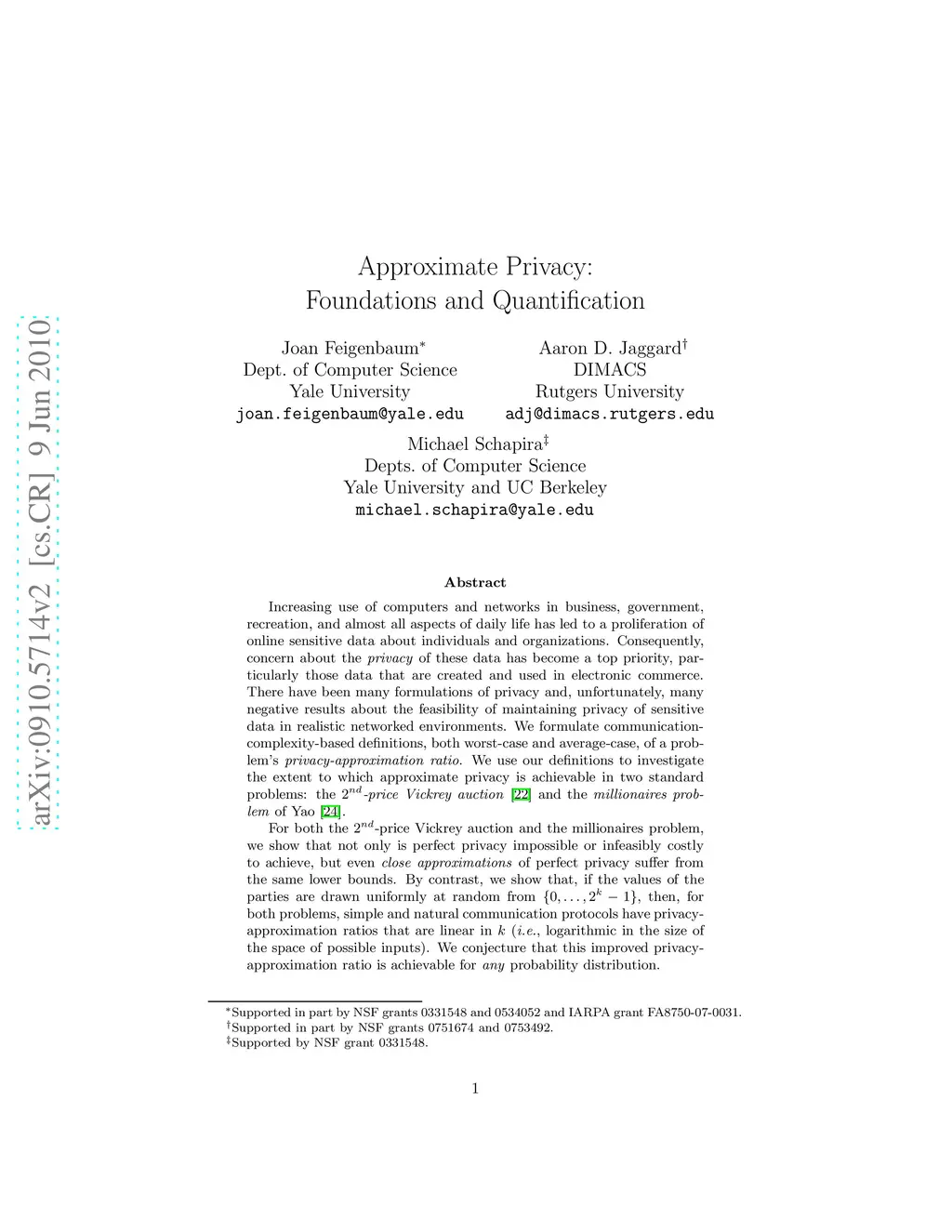 Increasing use of computers and networks in business, government, recreation, and almost all aspects of daily life has led to a proliferation of online sensitive data about individuals and organizations. Consequently, concern about the privacy of these data has become a top priority, particularly those data that are created and used in electronic commerce. There have been many formulations of privacy and, unfortunately, many negative results about the feasibility of maintaining privacy of sensitive data in realistic networked environments. We formulate communication-complexity-based definitions, both worst-case and average-case, of a problem's privacy-approximation ratio. We use our definitions to investigate the extent to which approximate privacy is achievable in two standard problems: the second-price Vickrey auction and the millionaires problem of Yao. For both the second-price Vickrey auction and the millionaires problem, we show that not only is perfect privacy impossible or infeasibly costly to achieve, but even close approximations of perfect privacy suffer from the same lower bounds. By contrast, we show that, if the values of the parties are drawn uniformly at random from {0,...,2^k-1}, then, for both problems, simple and natural communication protocols have privacy-approximation ratios that are linear in k (i.e., logarithmic in the size of the space of possible inputs). We conjecture that this improved privacy-approximation ratio is achievable for any probability distribution.