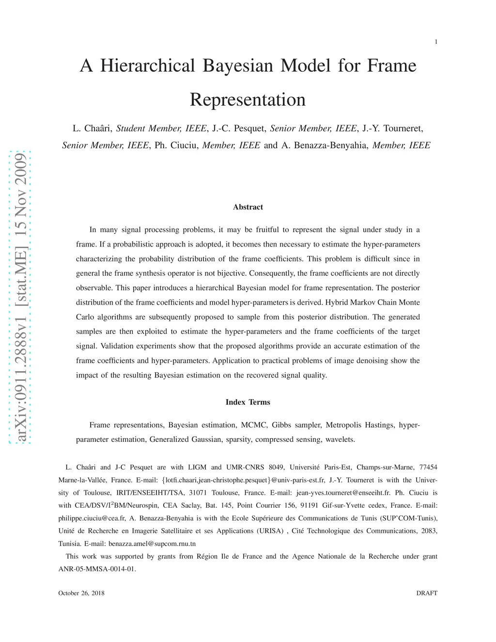 In many signal processing problems, it may be fruitful to represent the signal under study in a frame. If a probabilistic approach is adopted, it becomes then necessary to estimate the hyper-parameters characterizing the probability distribution of the frame coefficients. This problem is difficult since in general the frame synthesis operator is not bijective. Consequently, the frame coefficients are not directly observable. This paper introduces a hierarchical Bayesian model for frame representation. The posterior distribution of the frame coefficients and model hyper-parameters is derived. Hybrid Markov Chain Monte Carlo algorithms are subsequently proposed to sample from this posterior distribution. The generated samples are then exploited to estimate the hyper-parameters and the frame coefficients of the target signal. Validation experiments show that the proposed algorithms provide an accurate estimation of the frame coefficients and hyper-parameters. Application to practical problems of image denoising show the impact of the resulting Bayesian estimation on the recovered signal quality.