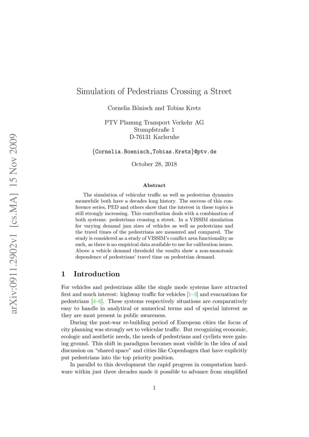 The simulation of vehicular traffic as well as pedestrian dynamics meanwhile both have a decades long history. The success of this conference series, PED and others show that the interest in these topics is still strongly increasing. This contribution deals with a combination of both systems: pedestrians crossing a street. In a VISSIM simulation for varying demand jam sizes of vehicles as well as pedestrians and the travel times of the pedestrians are measured and compared. The study is considered as a study of VISSIM's con ict area functionality as such, as there is no empirical data available to use for calibration issues. Above a vehicle demand threshold the results show a non-monotonic dependence of pedestrians' travel time on pedestrian demand.