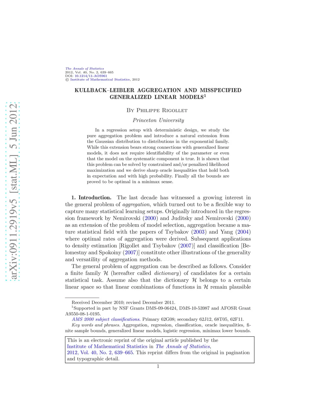 Kullback-Leibler aggregation and misspecified generalized linear models