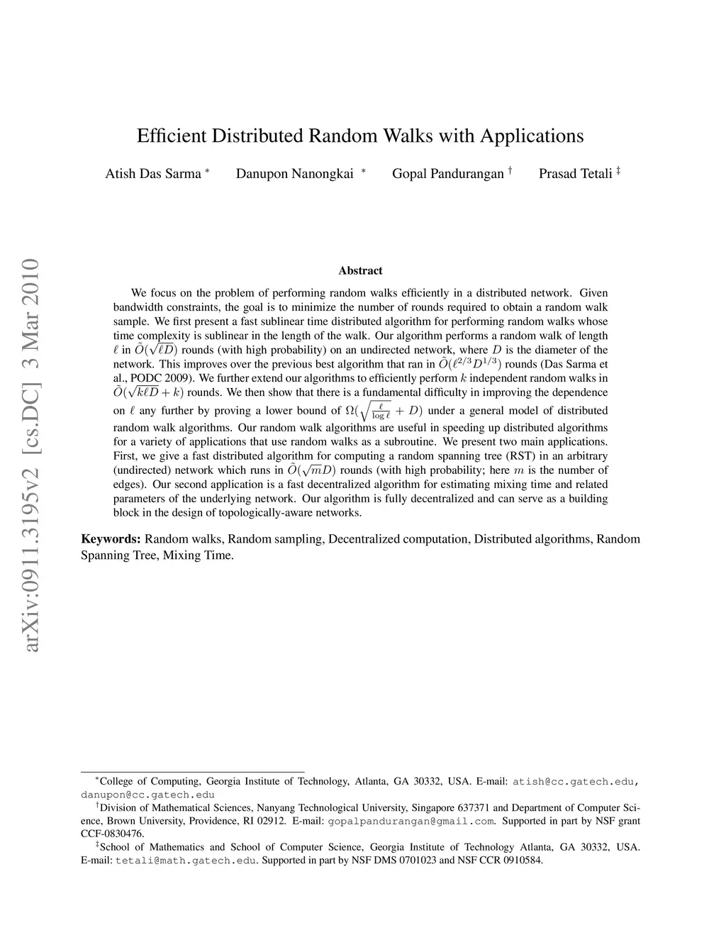 We focus on the problem of performing random walks efficiently in a distributed network. Given bandwidth constraints, the goal is to minimize the number of rounds required to obtain a random walk sample. We first present a fast sublinear time distributed algorithm for performing random walks whose time complexity is sublinear in the length of the walk. Our algorithm performs a random walk of length in rounds (with high probability) on an undirected network, where is the diameter of the network. This improves over the previous best algorithm that ran in rounds (Das Sarma et al., PODC 2009). We further extend our algorithms to efficiently perform independent random walks in rounds. We then show that there is a fundamental difficulty in improving the dependence on any further by proving a lower bound of under a general model of distributed random walk algorithms. Our random walk algorithms are useful in speeding up distributed algorithms for a variety of applications that use random walks as a subroutine. We present two main applications. First, we give a fast distributed algorithm for computing a random spanning tree (RST) in an arbitrary (undirected) network which runs in rounds (with high probability; here is the number of edges). Our second application is a fast decentralized algorithm for estimating mixing time and related parameters of the underlying network. Our algorithm is fully decentralized and can serve as a building block in the design of topologically-aware networks.