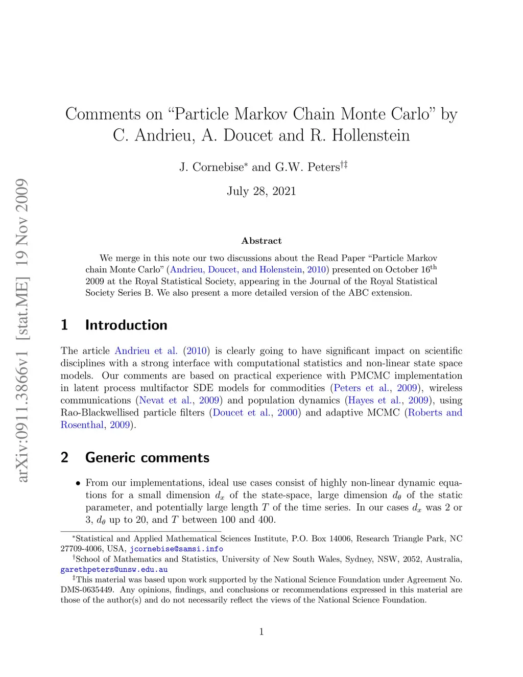 Comments on "Particle Markov Chain Monte Carlo" by C. Andrieu, A. Doucet