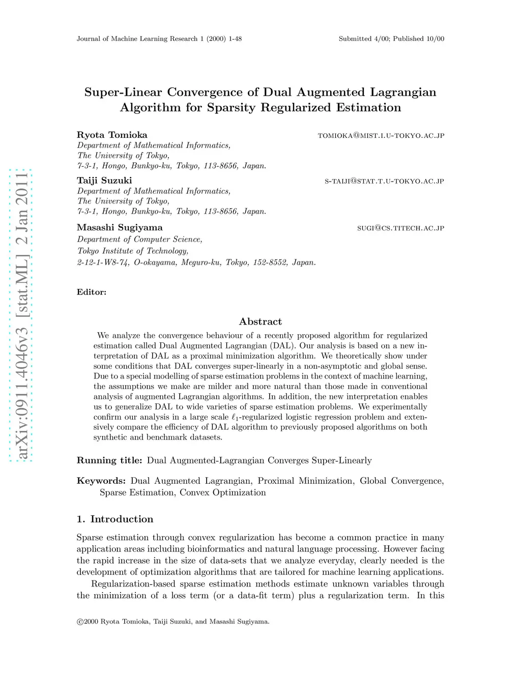 We analyze the convergence behaviour of a recently proposed algorithm for regularized estimation called Dual Augmented Lagrangian (DAL). Our analysis is based on a new interpretation of DAL as a proximal minimization algorithm. We theoretically show under some conditions that DAL converges super-linearly in a non-asymptotic and global sense. Due to a special modelling of sparse estimation problems in the context of machine learning, the assumptions we make are milder and more natural than those made in conventional analysis of augmented Lagrangian algorithms. In addition, the new interpretation enables us to generalize DAL to wide varieties of sparse estimation problems. We experimentally confirm our analysis in a large scale -regularized logistic regression problem and extensively compare the efficiency of DAL algorithm to previously proposed algorithms on both synthetic and benchmark datasets.