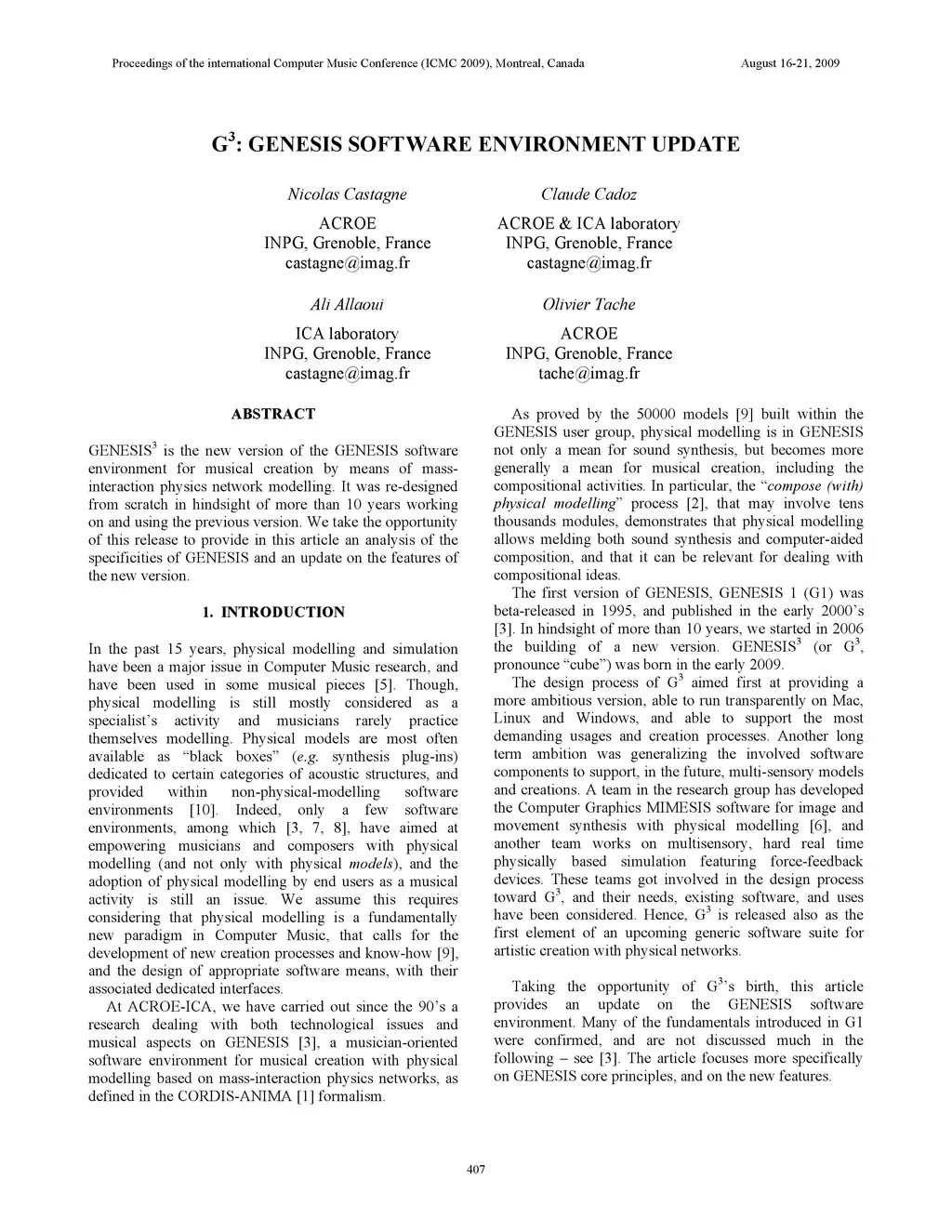 GENESIS3 is the new version of the GENESIS software environment for musical creation by means of mass-interaction physics network modeling. It was designed, and developed from scratch, in hindsight of more than 10 years working on and using the previous version. We take the opportunity of this birth to provide in this article (1) an analysis of the peculiarities in GENESIS, aiming at highlighting its core ?software paradigm?; and (2) an update on the features of the new version as compared to the last.