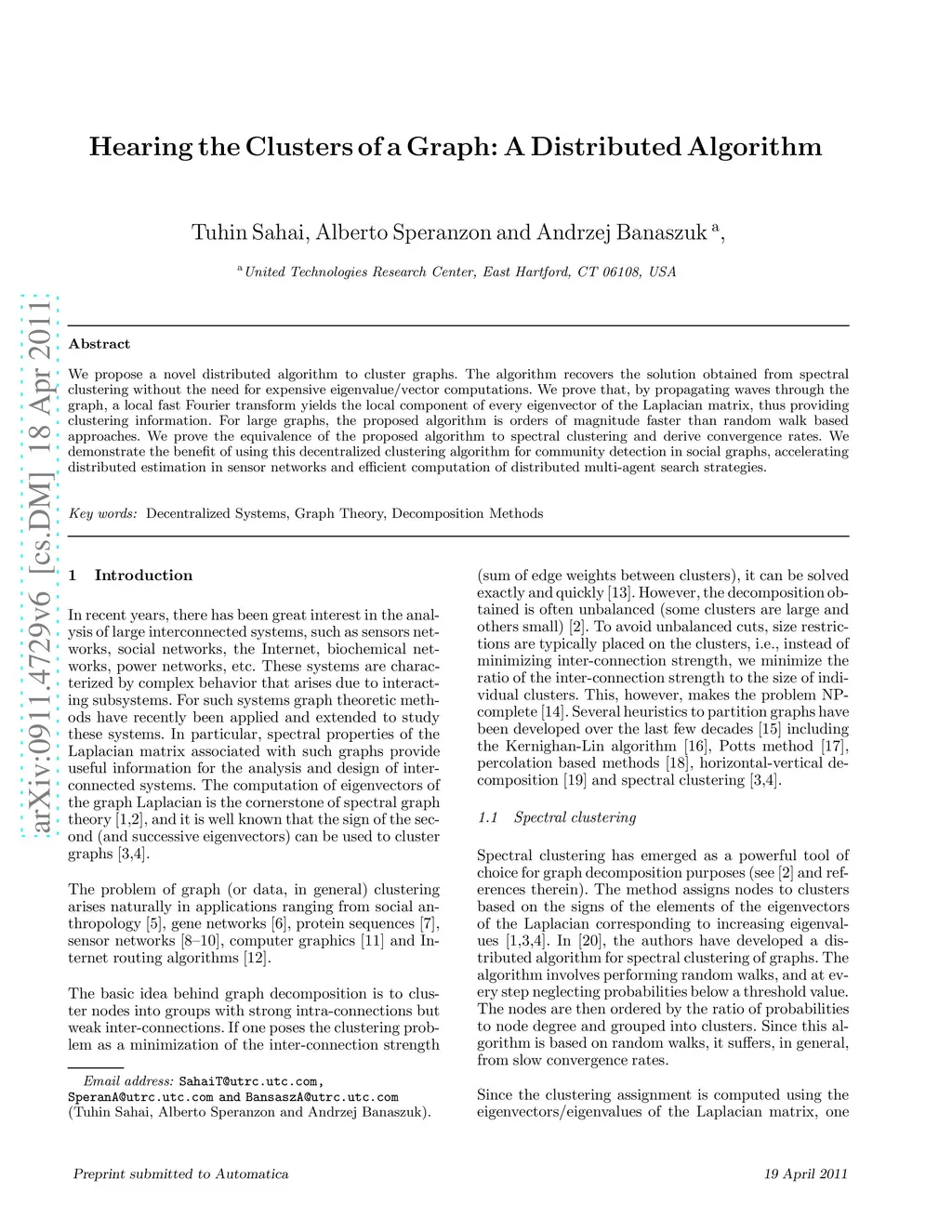 We propose a novel distributed algorithm to cluster graphs. The algorithm recovers the solution obtained from spectral clustering without the need for expensive eigenvalue/vector computations. We prove that, by propagating waves through the graph, a local fast Fourier transform yields the local component of every eigenvector of the Laplacian matrix, thus providing clustering information. For large graphs, the proposed algorithm is orders of magnitude faster than random walk based approaches. We prove the equivalence of the proposed algorithm to spectral clustering and derive convergence rates. We demonstrate the benefit of using this decentralized clustering algorithm for community detection in social graphs, accelerating distributed estimation in sensor networks and efficient computation of distributed multi-agent search strategies.