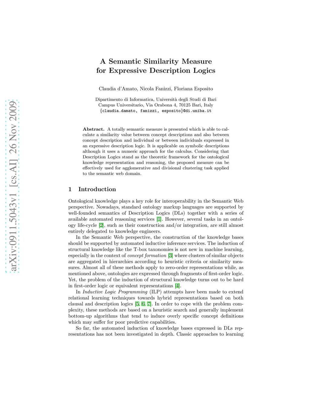 A totally semantic measure is presented which is able to calculate a similarity value between concept descriptions and also between concept description and individual or between individuals expressed in an expressive description logic. It is applicable on symbolic descriptions although it uses a numeric approach for the calculus. Considering that Description Logics stand as the theoretic framework for the ontological knowledge representation and reasoning, the proposed measure can be effectively used for agglomerative and divisional clustering task applied to the semantic web domain.