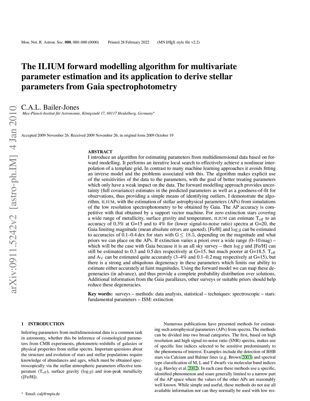I introduce an algorithm for estimating parameters from multidimensional data based on forward modelling. In contrast to many machine learning approaches it avoids fitting an inverse model and the problems associated with this. The algorithm makes explicit use of the sensitivities of the data to the parameters, with the goal of better treating parameters which only have a weak impact on the data. The forward modelling approach provides uncertainty (full covariance) estimates in the predicted parameters as well as a goodness-of-fit for observations. I demonstrate the algorithm, ILIUM, with the estimation of stellar astrophysical parameters (APs) from simulations of the low resolution spectrophotometry to be obtained by Gaia. The AP accuracy is competitive with that obtained by a support vector machine. For example, for zero extinction stars covering a wide range of metallicity, surface gravity and temperature, ILIUM can estimate Teff to an accuracy of 0.3% at G=15 and to 4% for (lower signal-to-noise ratio) spectra at G=20. [Fe/H] and logg can be estimated to accuracies of 0.1-0.4dex for stars with G<=18.5. If extinction varies a priori over a wide range (Av=0-10mag), then Teff and Av can be estimated quite accurately (3-4% and 0.1-0.2mag respectively at G=15), but there is a strong and ubiquitous degeneracy in these parameters which limits our ability to estimate either accurately at faint magnitudes. Using the forward model we can map these degeneracies (in advance), and thus provide a complete probability distribution over solutions. (Abridged)