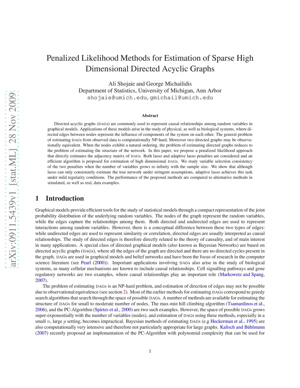 Directed acyclic graphs (DAGs) are commonly used to represent causal relationships among random variables in graphical models. Applications of these models arise in the study of physical, as well as biological systems, where directed edges between nodes represent the influence of components of the system on each other. The general problem of estimating DAGs from observed data is computationally NP-hard, Moreover two directed graphs may be observationally equivalent. When the nodes exhibit a natural ordering, the problem of estimating directed graphs reduces to the problem of estimating the structure of the network. In this paper, we propose a penalized likelihood approach that directly estimates the adjacency matrix of DAGs. Both lasso and adaptive lasso penalties are considered and an efficient algorithm is proposed for estimation of high dimensional DAGs. We study variable selection consistency of the two penalties when the number of variables grows to infinity with the sample size. We show that although lasso can only consistently estimate the true network under stringent assumptions, adaptive lasso achieves this task under mild regularity conditions. The performance of the proposed methods is compared to alternative methods in simulated, as well as real, data examples.