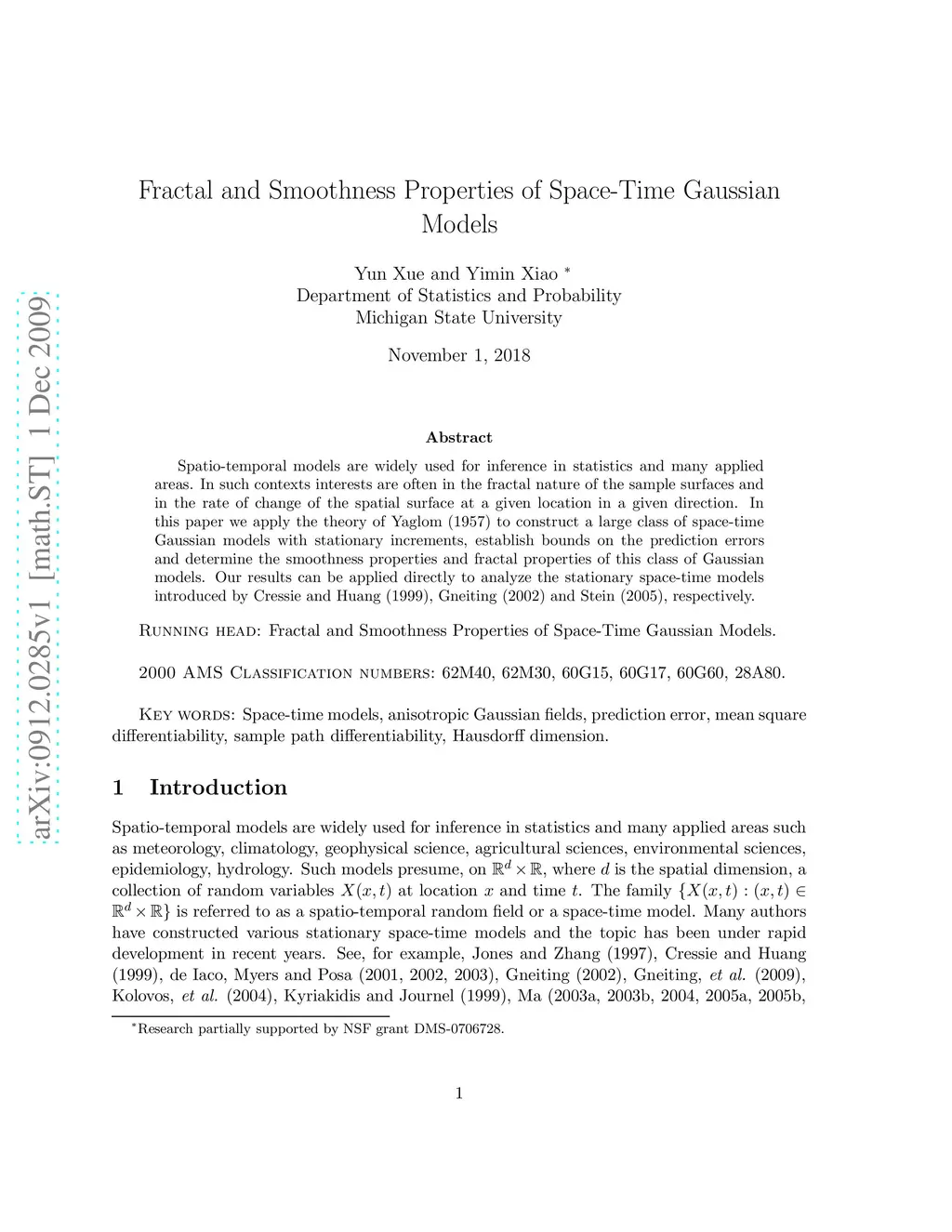 Spatio-temporal models are widely used for inference in statistics and many applied areas. In such contexts interests are often in the fractal nature of the sample surfaces and in the rate of change of the spatial surface at a given location in a given direction. In this paper we apply the theory of Yaglom (1957) to construct a large class of space-time Gaussian models with stationary increments, establish bounds on the prediction errors and determine the smoothness properties and fractal properties of this class of Gaussian models. Our results can be applied directly to analyze the stationary space-time models introduced by Cressie and Huang (1999), Gneiting (2002) and Stein (2005), respectively.