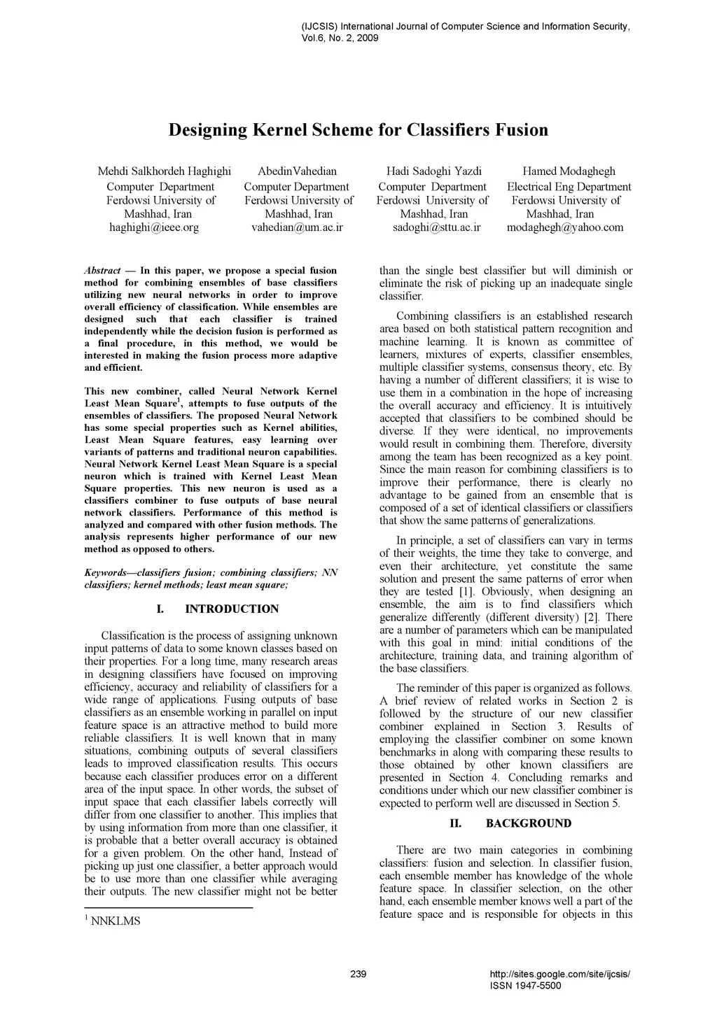 In this paper, we propose a special fusion method for combining ensembles of base classifiers utilizing new neural networks in order to improve overall efficiency of classification. While ensembles are designed such that each classifier is trained independently while the decision fusion is performed as a final procedure, in this method, we would be interested in making the fusion process more adaptive and efficient. This new combiner, called Neural Network Kernel Least Mean Square1, attempts to fuse outputs of the ensembles of classifiers. The proposed Neural Network has some special properties such as Kernel abilities,Least Mean Square features, easy learning over variants of patterns and traditional neuron capabilities. Neural Network Kernel Least Mean Square is a special neuron which is trained with Kernel Least Mean Square properties. This new neuron is used as a classifiers combiner to fuse outputs of base neural network classifiers. Performance of this method is analyzed and compared with other fusion methods. The analysis represents higher performance of our new method as opposed to others.