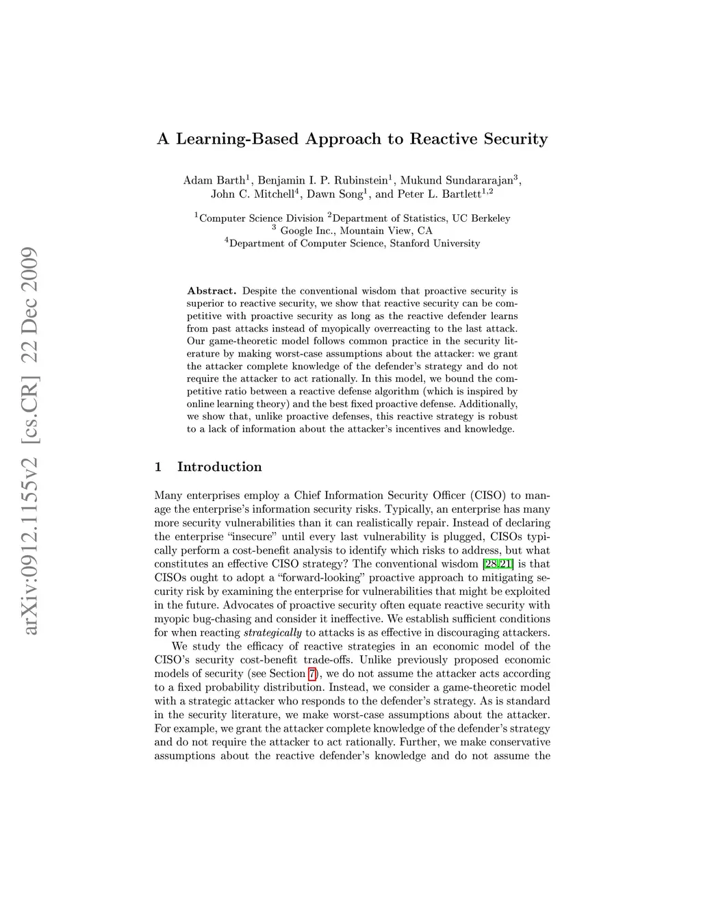 Despite the conventional wisdom that proactive security is superior to reactive security, we show that reactive security can be competitive with proactive security as long as the reactive defender learns from past attacks instead of myopically overreacting to the last attack. Our game-theoretic model follows common practice in the security literature by making worst-case assumptions about the attacker: we grant the attacker complete knowledge of the defender's strategy and do not require the attacker to act rationally. In this model, we bound the competitive ratio between a reactive defense algorithm (which is inspired by online learning theory) and the best fixed proactive defense. Additionally, we show that, unlike proactive defenses, this reactive strategy is robust to a lack of information about the attacker's incentives and knowledge.