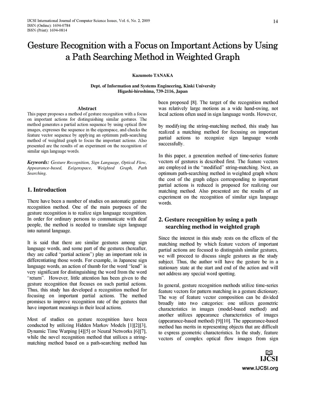 This paper proposes a method of gesture recognition with a focus on important actions for distinguishing similar gestures. The method generates a partial action sequence by using optical flow images, expresses the sequence in the eigenspace, and checks the feature vector sequence by applying an optimum path-searching method of weighted graph to focus the important actions. Also presented are the results of an experiment on the recognition of similar sign language words.