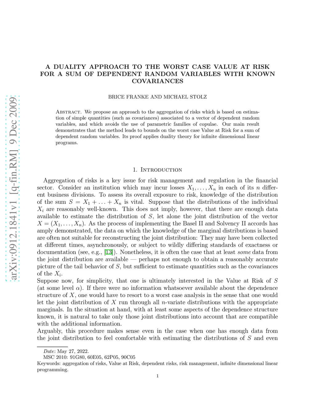 We propose an approach to the aggregation of risks which is based on estimation of simple quantities (such as covariances) associated to a vector of dependent random variables, and which avoids the use of parametric families of copulae. Our main result demonstrates that the method leads to bounds on the worst case Value at Risk for a sum of dependent random variables. Its proof applies duality theory for infinite dimensional linear programs.