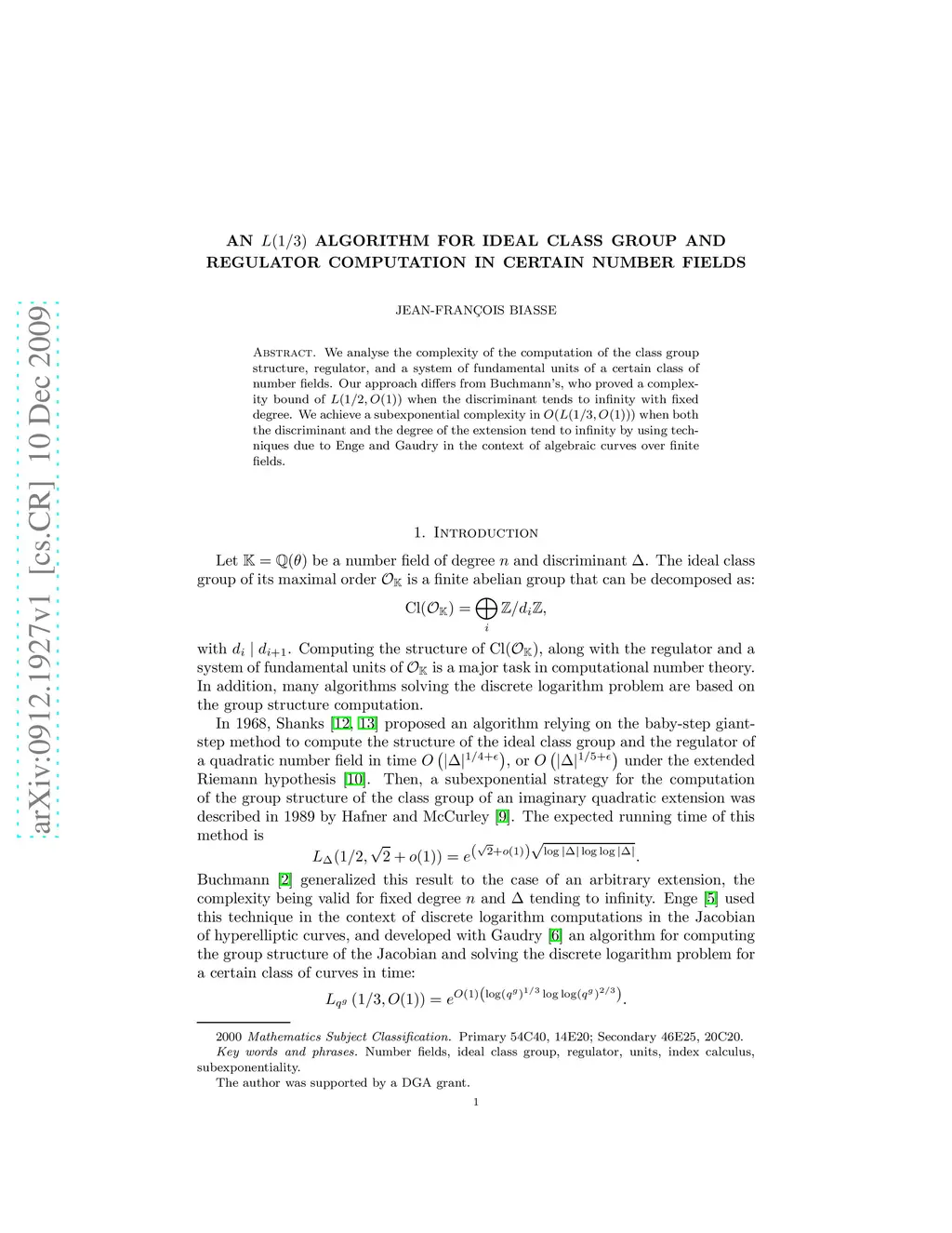 We analyse the complexity of the computation of the class group structure, regulator, and a system of fundamental units of a certain class of number fields. Our approach differs from Buchmann's, who proved a complexity bound of L(1/2,O(1)) when the discriminant tends to infinity with fixed degree. We achieve a subexponential complexity in O(L(1/3,O(1))) when both the discriminant and the degree of the extension tend to infinity by using techniques due to Enge and Gaudry in the context of algebraic curves over finite fields.