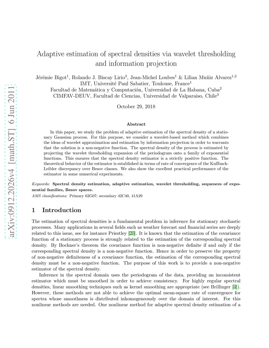 In this paper, we study the problem of adaptive estimation of the spectral density of a stationary Gaussian process. For this purpose, we consider a wavelet-based method which combines the ideas of wavelet approximation and estimation by information projection in order to warrants that the solution is a nonnegative function. The spectral density of the process is estimated by projecting the wavelet thresholding expansion of the periodogram onto a family of exponential functions. This ensures that the spectral density estimator is a strictly positive function. Then, by Bochner's theorem, the corresponding estimator of the covariance function is semidefinite positive. The theoretical behavior of the estimator is established in terms of rate of convergence of the Kullback-Leibler discrepancy over Besov classes. We also show the excellent practical performance of the estimator in some numerical experiments.