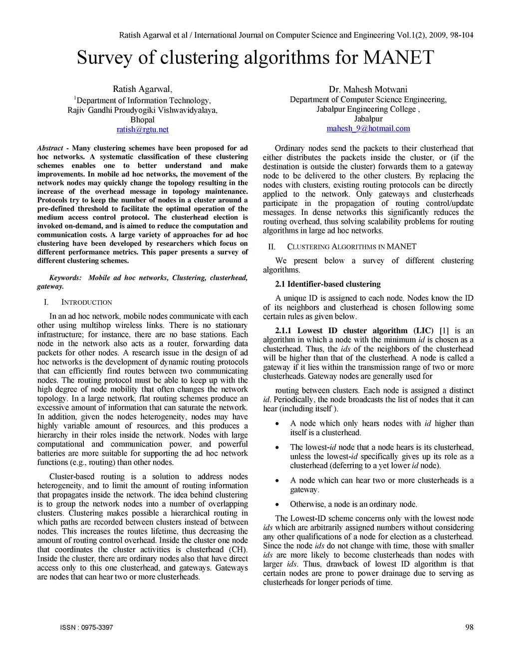 Many clustering schemes have been proposed for ad hoc networks. A systematic classification of these clustering schemes enables one to better understand and make improvements. In mobile ad hoc networks, the movement of the network nodes may quickly change the topology resulting in the increase of the overhead message in topology maintenance. Protocols try to keep the number of nodes in a cluster around a pre-defined threshold to facilitate the optimal operation of the medium access control protocol. The clusterhead election is invoked on-demand, and is aimed to reduce the computation and communication costs. A large variety of approaches for ad hoc clustering have been developed by researchers which focus on different performance metrics. This paper presents a survey of different clustering schemes.