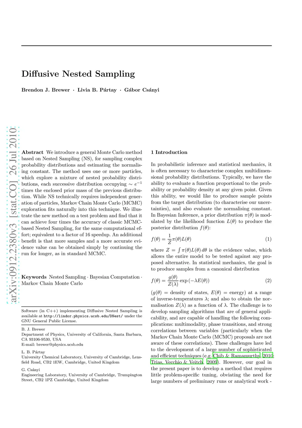 We introduce a general Monte Carlo method based on Nested Sampling (NS), for sampling complex probability distributions and estimating the normalising constant. The method uses one or more particles, which explore a mixture of nested probability distributions, each successive distribution occupying ~e^-1 times the enclosed prior mass of the previous distribution. While NS technically requires independent generation of particles, Markov Chain Monte Carlo (MCMC) exploration fits naturally into this technique. We illustrate the new method on a test problem and find that it can achieve four times the accuracy of classic MCMC-based Nested Sampling, for the same computational effort; equivalent to a factor of 16 speedup. An additional benefit is that more samples and a more accurate evidence value can be obtained simply by continuing the run for longer, as in standard MCMC.