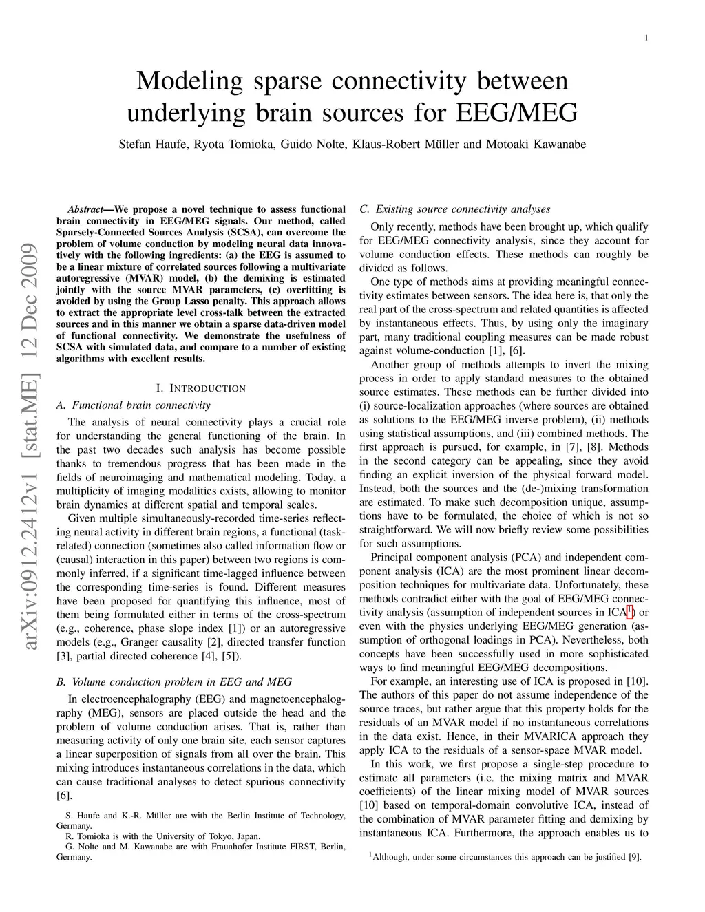We propose a novel technique to assess functional brain connectivity in EEG/MEG signals. Our method, called Sparsely-Connected Sources Analysis (SCSA), can overcome the problem of volume conduction by modeling neural data innovatively with the following ingredients: (a) the EEG is assumed to be a linear mixture of correlated sources following a multivariate autoregressive (MVAR) model, (b) the demixing is estimated jointly with the source MVAR parameters, (c) overfitting is avoided by using the Group Lasso penalty. This approach allows to extract the appropriate level cross-talk between the extracted sources and in this manner we obtain a sparse data-driven model of functional connectivity. We demonstrate the usefulness of SCSA with simulated data, and compare to a number of existing algorithms with excellent results.