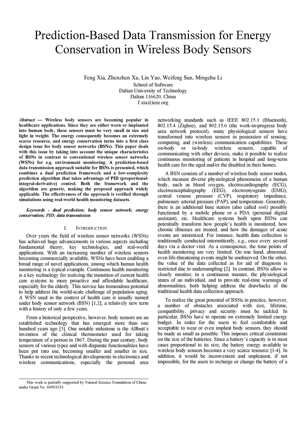 Wireless body sensors are becoming popular in healthcare applications. Since they are either worn or implanted into human body, these sensors must be very small in size and light in weight. The energy consequently becomes an extremely scarce resource, and energy conservation turns into a first class design issue for body sensor networks (BSNs). This paper deals with this issue by taking into account the unique characteristics of BSNs in contrast to conventional wireless sensor networks (WSNs) for e.g. environment monitoring. A prediction-based data transmission approach suitable for BSNs is presented, which combines a dual prediction framework and a low-complexity prediction algorithm that takes advantage of PID (proportional-integral-derivative) control. Both the framework and the algorithm are generic, making the proposed approach widely applicable. The effectiveness of the approach is verified through simulations using real-world health monitoring datasets.