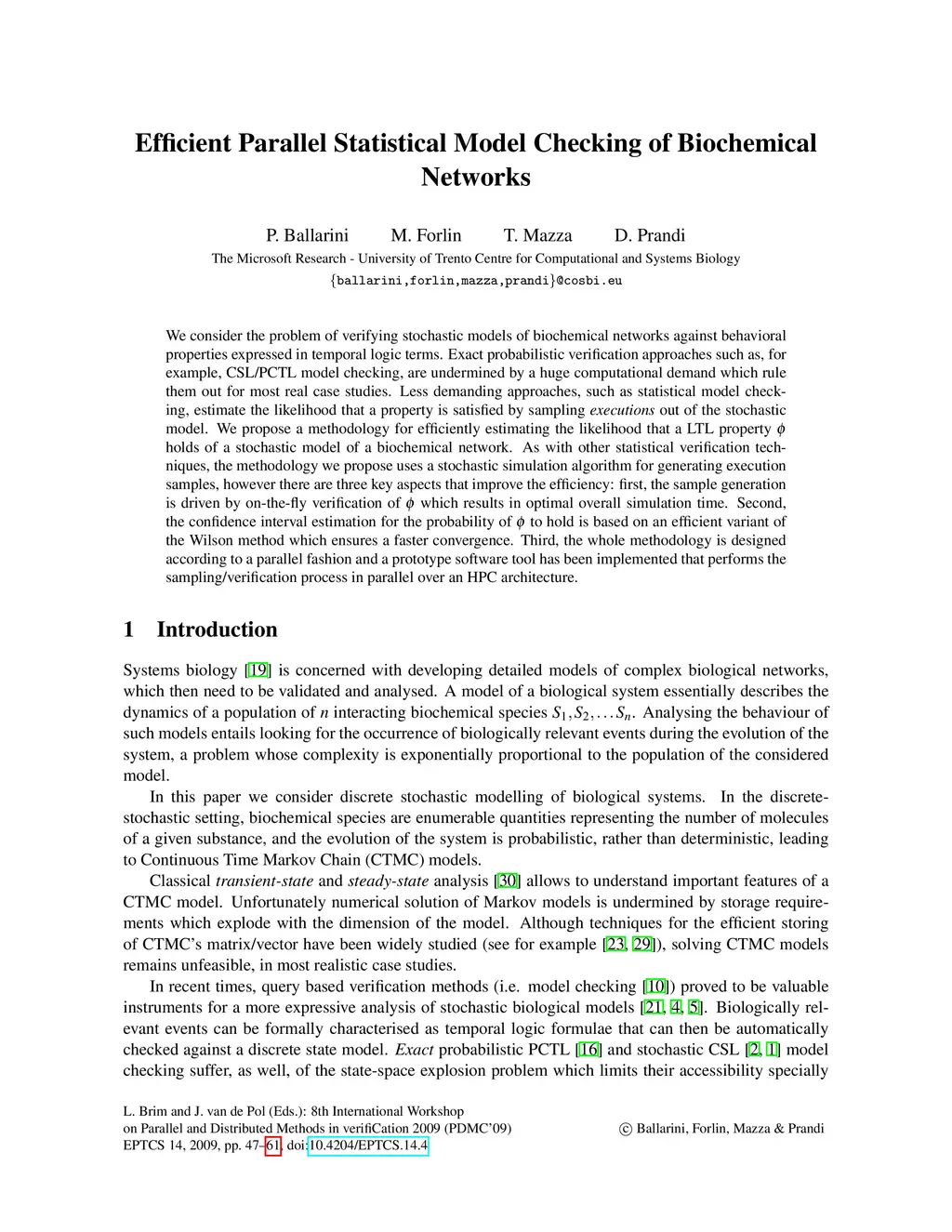 We consider the problem of verifying stochastic models of biochemical networks against behavioral properties expressed in temporal logic terms. Exact probabilistic verification approaches such as, for example, CSL/PCTL model checking, are undermined by a huge computational demand which rule them out for most real case studies. Less demanding approaches, such as statistical model checking, estimate the likelihood that a property is satisfied by sampling executions out of the stochastic model. We propose a methodology for efficiently estimating the likelihood that a LTL property P holds of a stochastic model of a biochemical network. As with other statistical verification techniques, the methodology we propose uses a stochastic simulation algorithm for generating execution samples, however there are three key aspects that improve the efficiency: first, the sample generation is driven by on-the-fly verification of P which results in optimal overall simulation time. Second, the confidence interval estimation for the probability of P to hold is based on an efficient variant of the Wilson method which ensures a faster convergence. Third, the whole methodology is designed according to a parallel fashion and a prototype software tool has been implemented that performs the sampling/verification process in parallel over an HPC architecture.