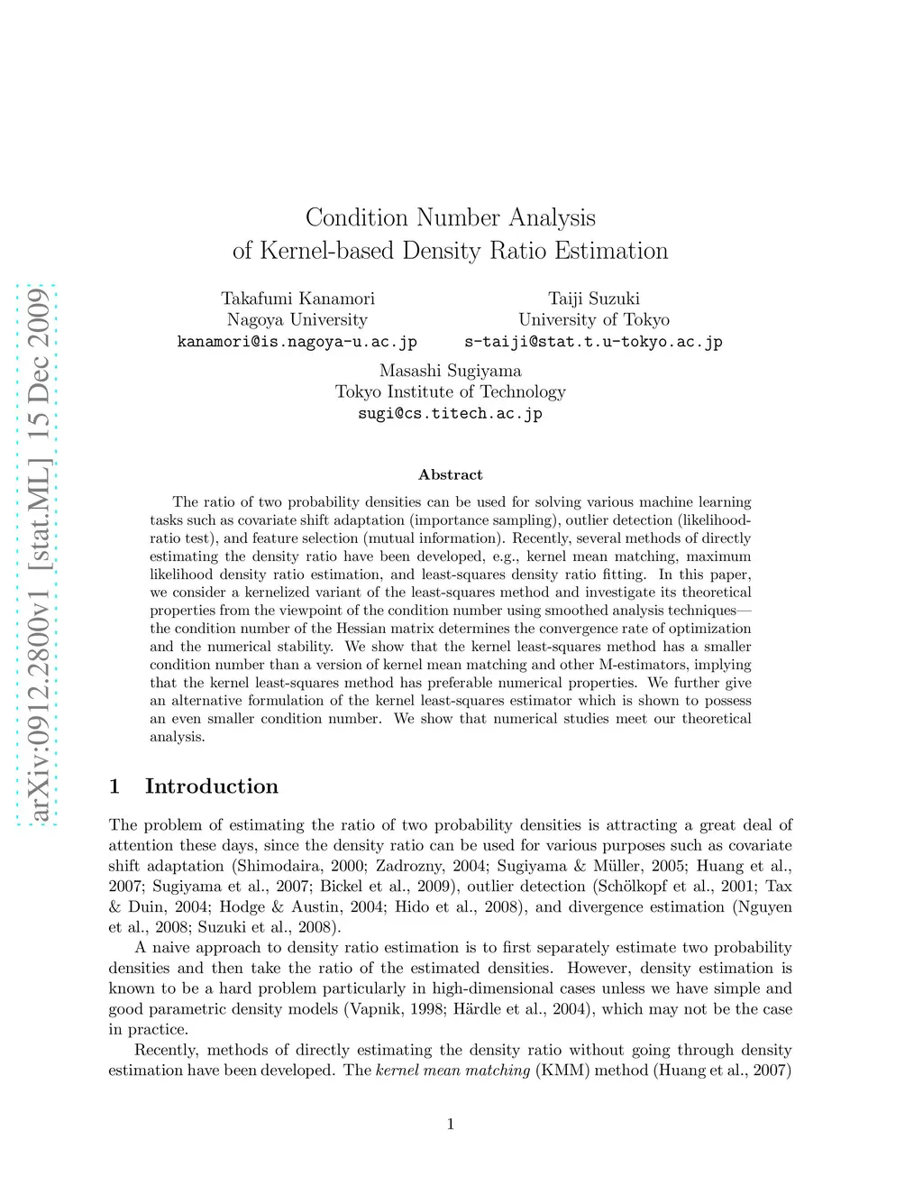 The ratio of two probability densities can be used for solving various machine learning tasks such as covariate shift adaptation (importance sampling), outlier detection (likelihood-ratio test), and feature selection (mutual information). Recently, several methods of directly estimating the density ratio have been developed, e.g., kernel mean matching, maximum likelihood density ratio estimation, and least-squares density ratio fitting. In this paper, we consider a kernelized variant of the least-squares method and investigate its theoretical properties from the viewpoint of the condition number using smoothed analysis techniques--the condition number of the Hessian matrix determines the convergence rate of optimization and the numerical stability. We show that the kernel least-squares method has a smaller condition number than a version of kernel mean matching and other M-estimators, implying that the kernel least-squares method has preferable numerical properties. We further give an alternative formulation of the kernel least-squares estimator which is shown to possess an even smaller condition number. We show that numerical studies meet our theoretical analysis.