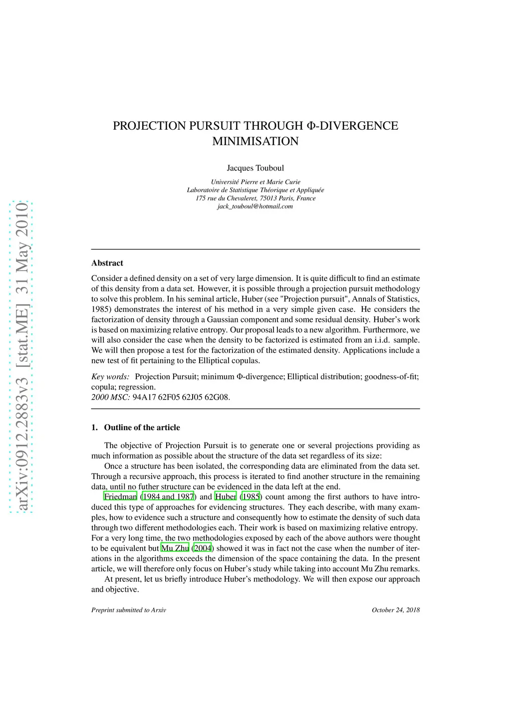 Consider a defined density on a set of very large dimension. It is quite difficult to find an estimate of this density from a data set. However, it is possible through a projection pursuit methodology to solve this problem. Touboul's article "Projection Pursuit Through Relative Entropy Minimization", 2009, demonstrates the interest of the author's method in a very simple given case. He considers the factorization of a density through an Elliptical component and some residual density. The above Touboul's work is based on minimizing relative entropy. In the present article, our proposal will aim at extending this very methodology to the divergence. Furthermore, we will also consider the case when the density to be factorized is estimated from an i.i.d. sample. We will then propose a test for the factorization of the estimated density. Applications include a new test of fit pertaining to the Elliptical copulas.
