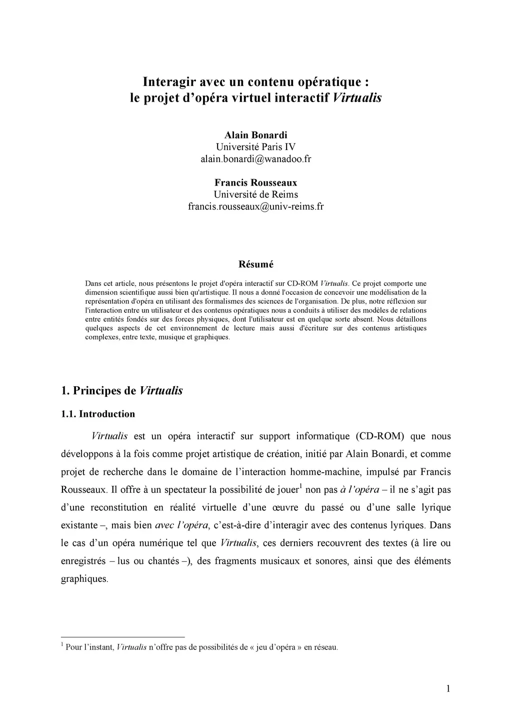 In this article, we present the interactive opera project on CD-ROM Virtualis. This project includes a scientific dimension as well as artistic. It gave us the opportunity to design a model of the opera performance using formalisms from organization sciences. Moreover, our investigation on interactions between a user and opera contents led us to use models of relationships between entities based on physical forces, where the user is in a way absent. We detail some aspects of a reading but also writing environment on artistic complex contents between text, music and graphics.