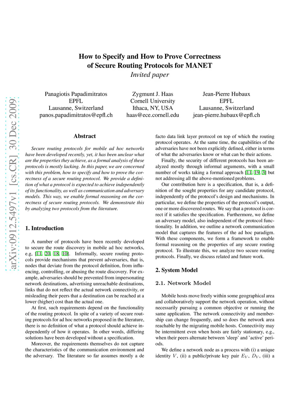 Secure routing protocols for mobile ad hoc networks have been developed recently, yet, it has been unclear what are the properties they achieve, as a formal analysis of these protocols is mostly lacking. In this paper, we are concerned with this problem, how to specify and how to prove the correctness of a secure routing protocol. We provide a definition of what a protocol is expected to achieve independently of its functionality, as well as communication and adversary models. This way, we enable formal reasoning on the correctness of secure routing protocols. We demonstrate this by analyzing two protocols from the literature.