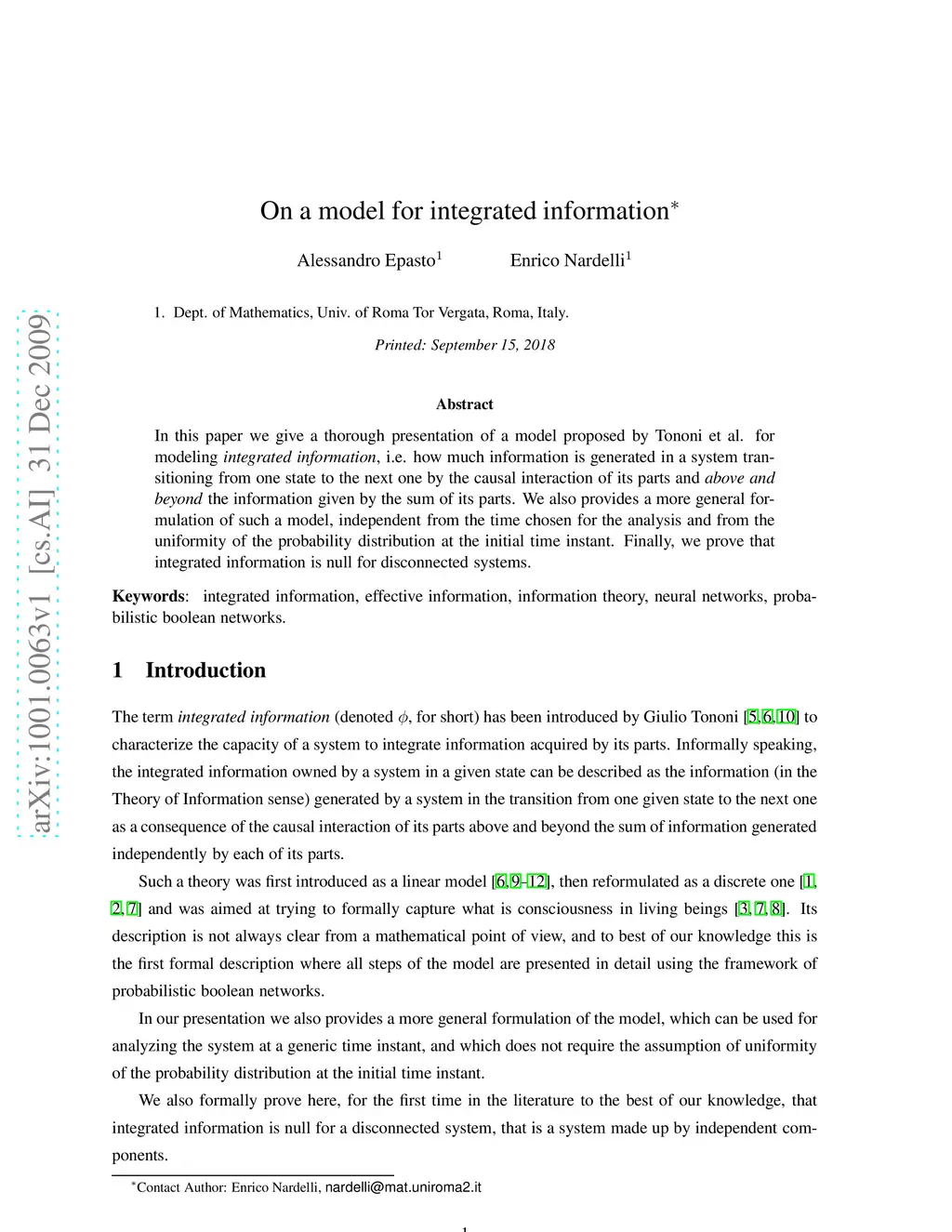 In this paper we give a thorough presentation of a model proposed by Tononi et al. for modeling \emph{integrated information}, i.e. how much information is generated in a system transitioning from one state to the next one by the causal interaction of its parts and \emph{above and beyond} the information given by the sum of its parts. We also provides a more general formulation of such a model, independent from the time chosen for the analysis and from the uniformity of the probability distribution at the initial time instant. Finally, we prove that integrated information is null for disconnected systems.
