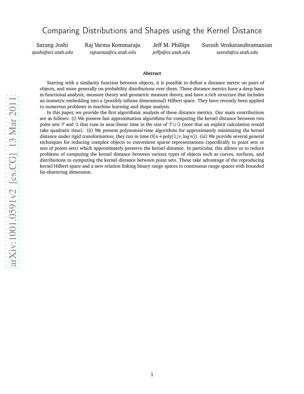 Starting with a similarity function between objects, it is possible to define a distance metric on pairs of objects, and more generally on probability distributions over them. These distance metrics have a deep basis in functional analysis, measure theory and geometric measure theory, and have a rich structure that includes an isometric embedding into a (possibly infinite dimensional) Hilbert space. They have recently been applied to numerous problems in machine learning and shape analysis. In this paper, we provide the first algorithmic analysis of these distance metrics. Our main contributions are as follows: (i) We present fast approximation algorithms for computing the kernel distance between two point sets P and Q that runs in near-linear time in the size of (P cup Q) (note that an explicit calculation would take quadratic time). (ii) We present polynomial-time algorithms for approximately minimizing the kernel distance under rigid transformation; they run in time O(n + poly(1/epsilon, log n)). (iii) We provide several general techniques for reducing complex objects to convenient sparse representations (specifically to point sets or sets of points sets) which approximately preserve the kernel distance. In particular, this allows us to reduce problems of computing the kernel distance between various types of objects such as curves, surfaces, and distributions to computing the kernel distance between point sets. These take advantage of the reproducing kernel Hilbert space and a new relation linking binary range spaces to continuous range spaces with bounded fat-shattering dimension.