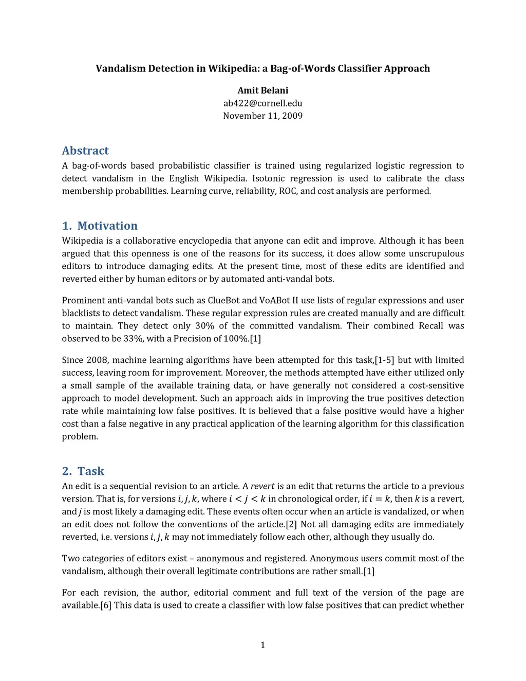 A bag-of-words based probabilistic classifier is trained using regularized logistic regression to detect vandalism in the English Wikipedia. Isotonic regression is used to calibrate the class membership probabilities. Learning curve, reliability, ROC, and cost analysis are performed.