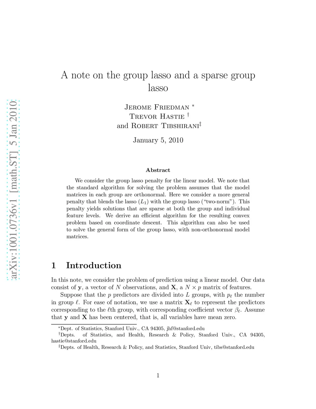 We consider the group lasso penalty for the linear model. We note that the standard algorithm for solving the problem assumes that the model matrices in each group are orthonormal. Here we consider a more general penalty that blends the lasso (L1) with the group lasso ("two-norm"). This penalty yields solutions that are sparse at both the group and individual feature levels. We derive an efficient algorithm for the resulting convex problem based on coordinate descent. This algorithm can also be used to solve the general form of the group lasso, with non-orthonormal model matrices.