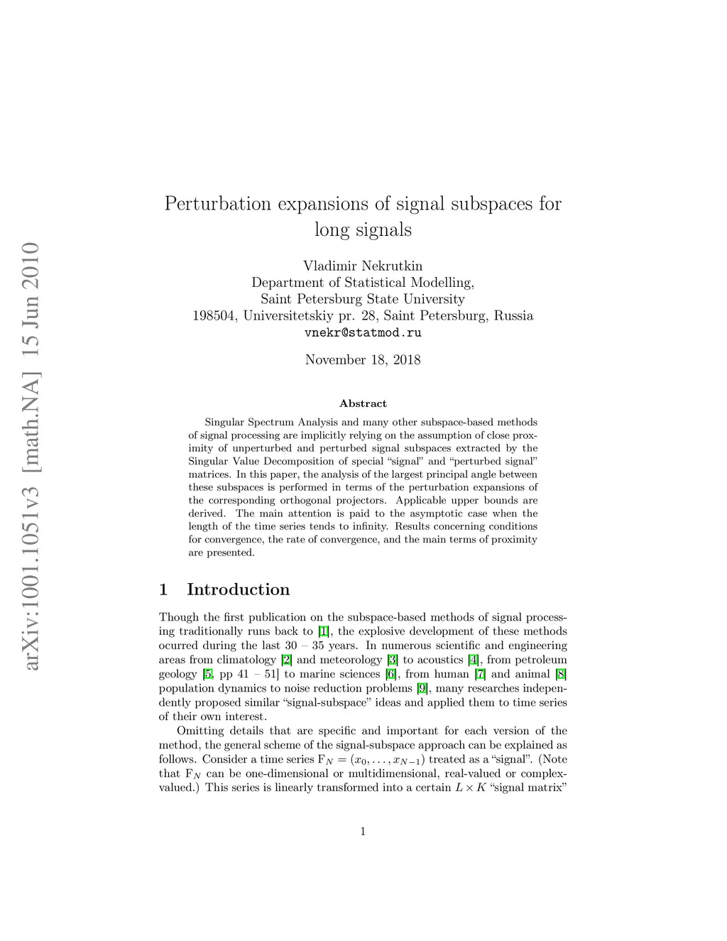 Singular Spectrum Analysis and many other subspace-based methods of signal processing are implicitly relying on the assumption of close proximity of unperturbed and perturbed signal subspaces extracted by the Singular Value Decomposition of special "signal" and "perturbed signal" matrices. In this paper, the analysis of the main principal angle between these subspaces is performed in terms of the perturbation expansions of the corresponding orthogonal projectors. Applicable upper bounds are derived. The main attention is paid to the asymptotical case when the length of the time series tends to infinity. Results concerning conditions for convergence, rate of convergence, and the main terms of proximity are presented.