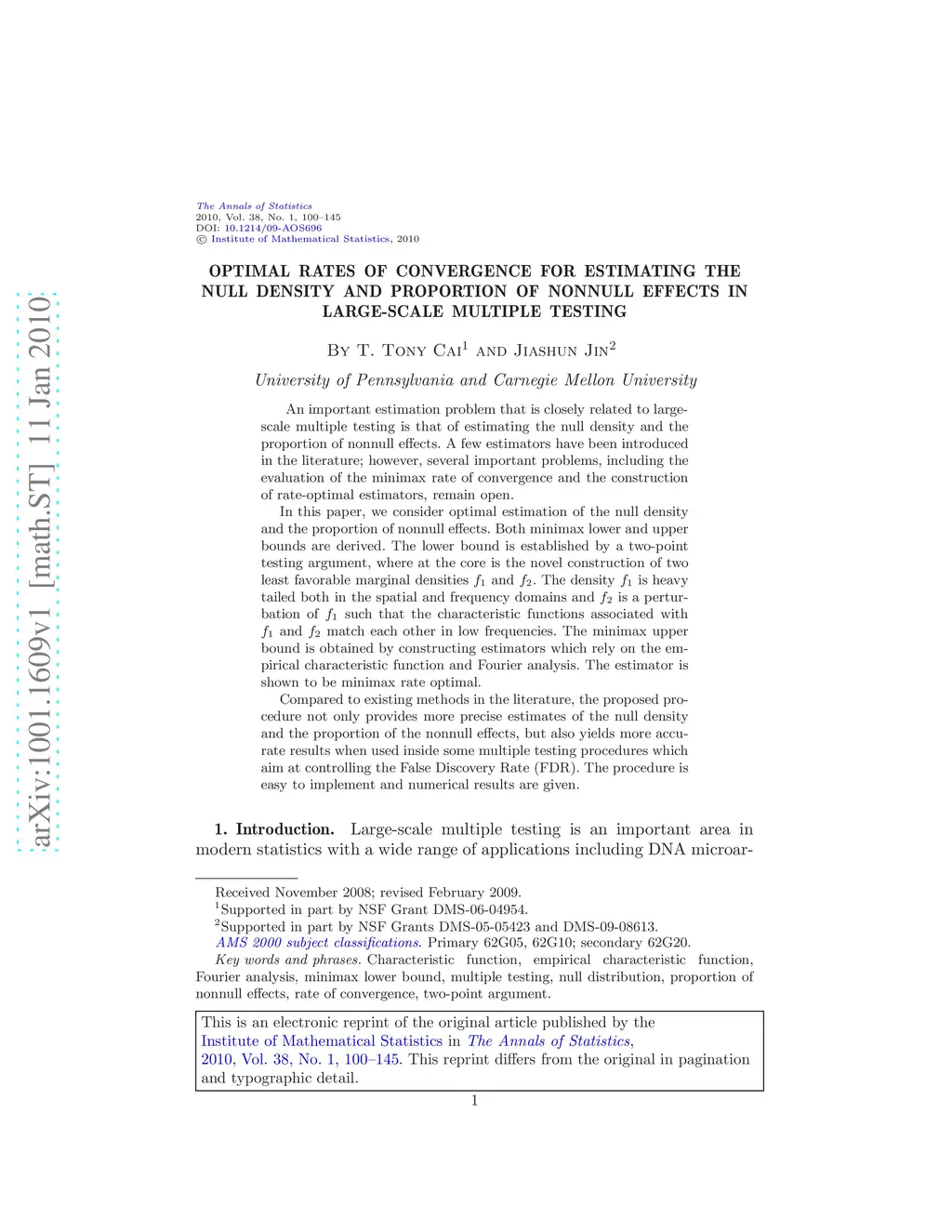 An important estimation problem that is closely related to large-scale multiple testing is that of estimating the null density and the proportion of nonnull effects. A few estimators have been introduced in the literature; however, several important problems, including the evaluation of the minimax rate of convergence and the construction of rate-optimal estimators, remain open. In this paper, we consider optimal estimation of the null density and the proportion of nonnull effects. Both minimax lower and upper bounds are derived. The lower bound is established by a two-point testing argument, where at the core is the novel construction of two least favorable marginal densities and . The density is heavy tailed both in the spatial and frequency domains and is a perturbation of such that the characteristic functions associated with and match each other in low frequencies. The minimax upper bound is obtained by constructing estimators which rely on the empirical characteristic function and Fourier analysis. The estimator is shown to be minimax rate optimal. Compared to existing methods in the literature, the proposed procedure not only provides more precise estimates of the null density and the proportion of the nonnull effects, but also yields more accurate results when used inside some multiple testing procedures which aim at controlling the False Discovery Rate (FDR). The procedure is easy to implement and numerical results are given.