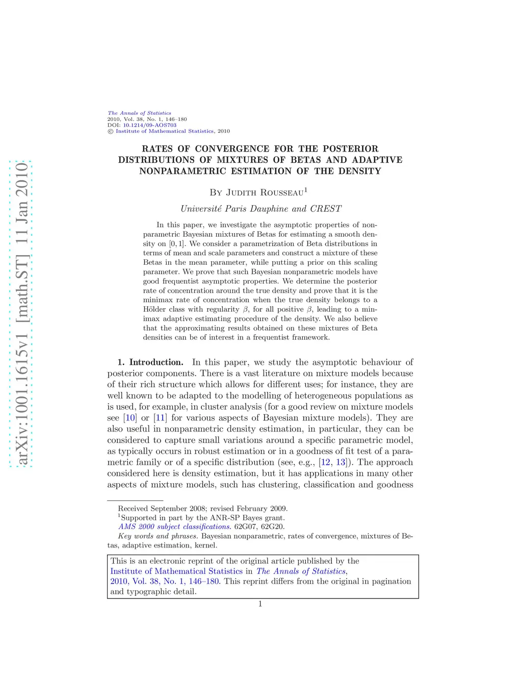 In this paper, we investigate the asymptotic properties of nonparametric Bayesian mixtures of Betas for estimating a smooth density on . We consider a parametrization of Beta distributions in terms of mean and scale parameters and construct a mixture of these Betas in the mean parameter, while putting a prior on this scaling parameter. We prove that such Bayesian nonparametric models have good frequentist asymptotic properties. We determine the posterior rate of concentration around the true density and prove that it is the minimax rate of concentration when the true density belongs to a H\"{o}lder class with regularity , for all positive , leading to a minimax adaptive estimating procedure of the density. We also believe that the approximating results obtained on these mixtures of Beta densities can be of interest in a frequentist framework.