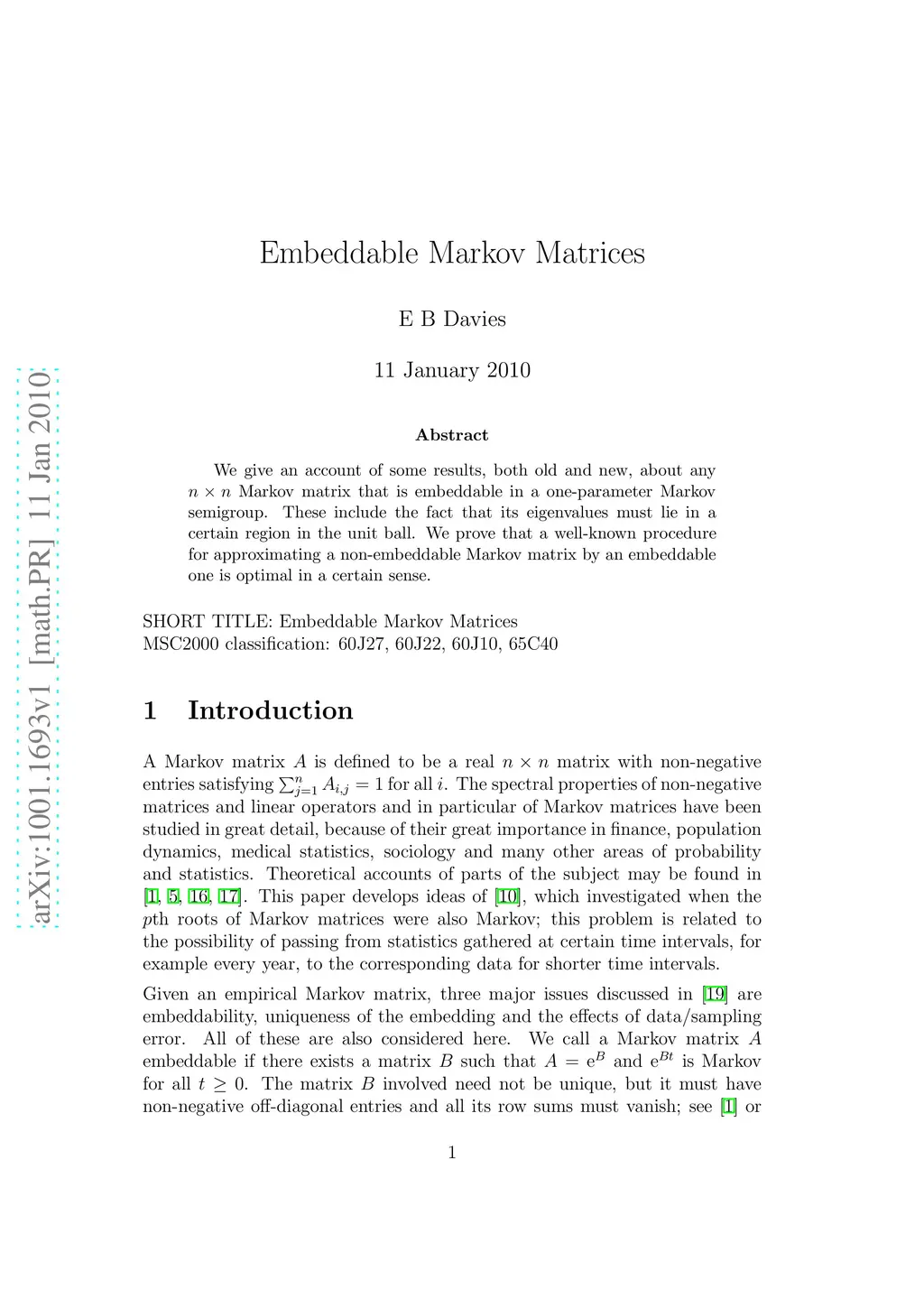 We give an account of some results, both old and new, about any Markov matrix that is embeddable in a one-parameter Markov semigroup. These include the fact that its eigenvalues must lie in a certain region in the unit ball. We prove that a well-known procedure for approximating a non-embeddable Markov matrix by an embeddable one is optimal in a certain sense.
